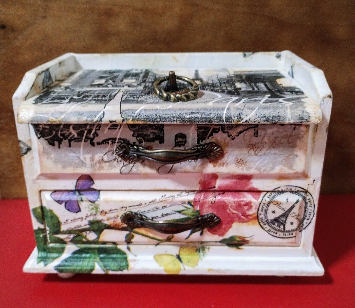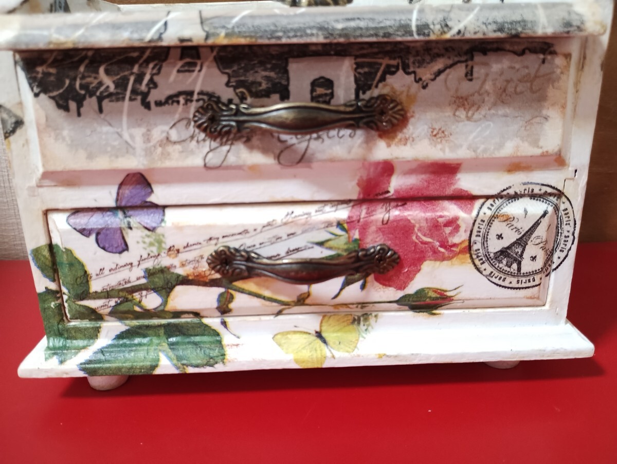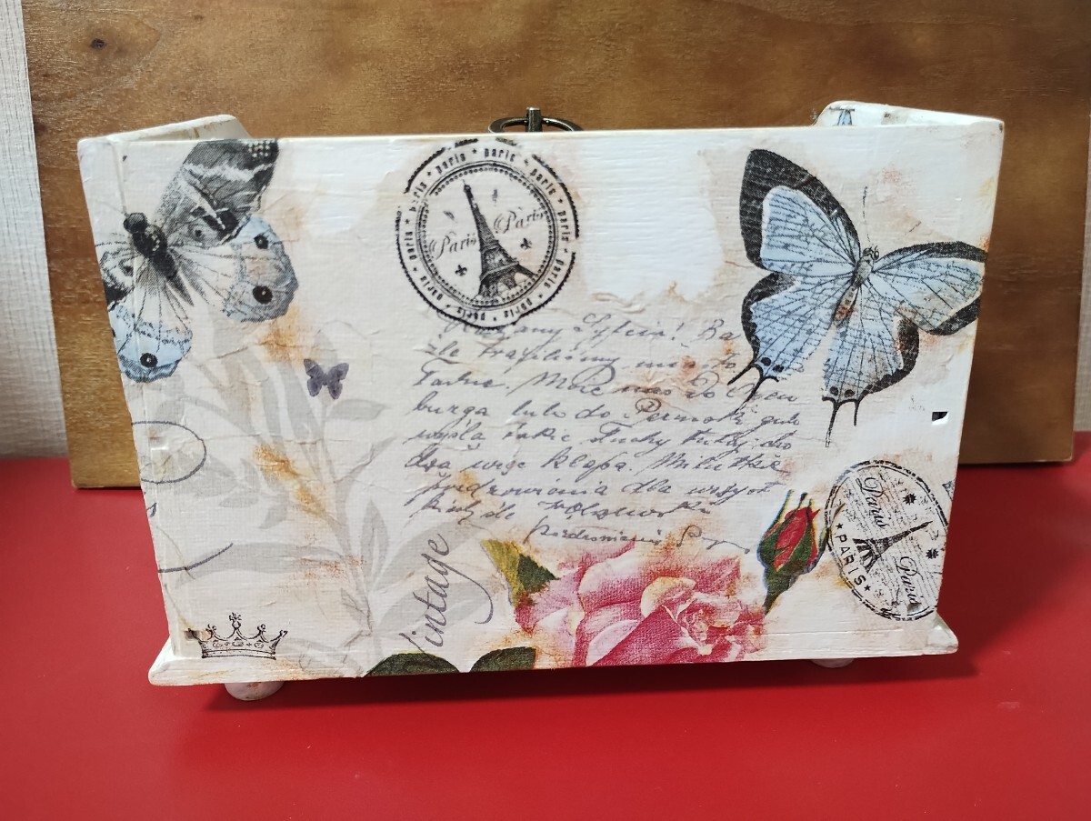 中古の小物入れを購入し、ヤスリで削り、あえてキズをつけてアンティーク調に仕上げています。