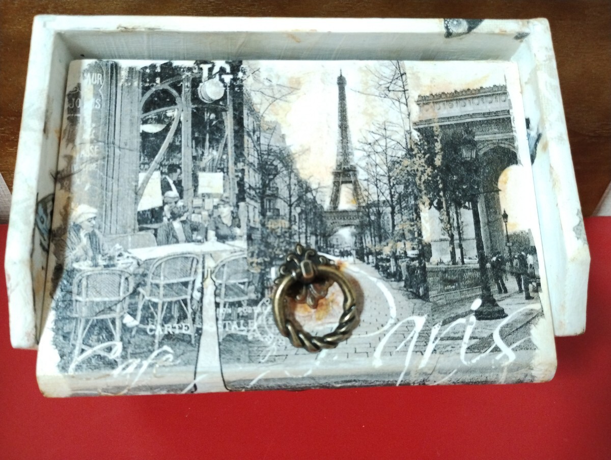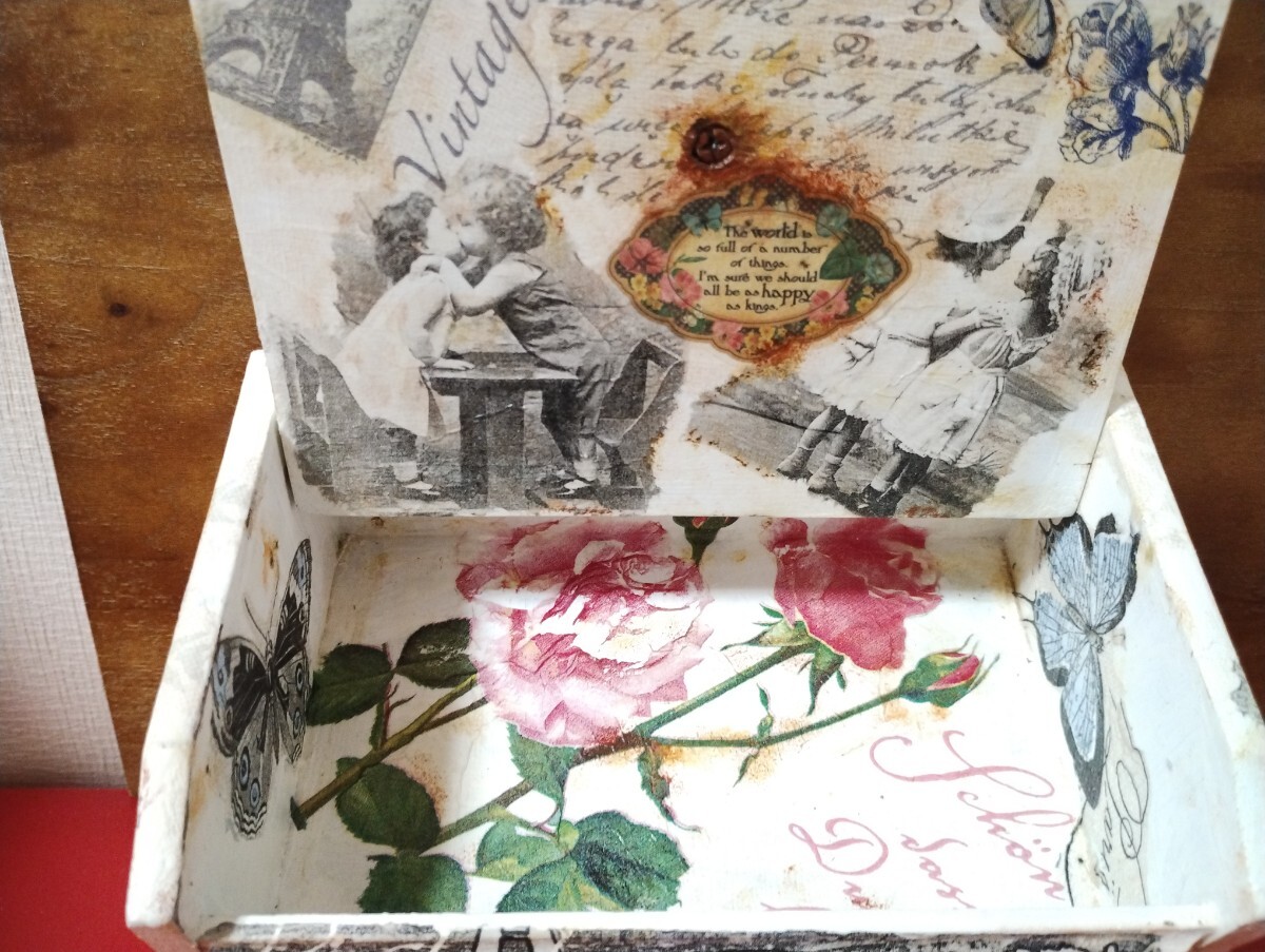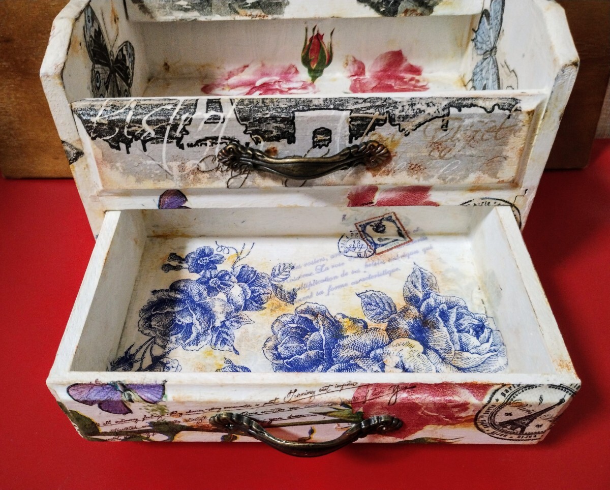 中古の小物入れを購入し、ヤスリで削り、あえてキズをつけてアンティーク調に仕上げています。