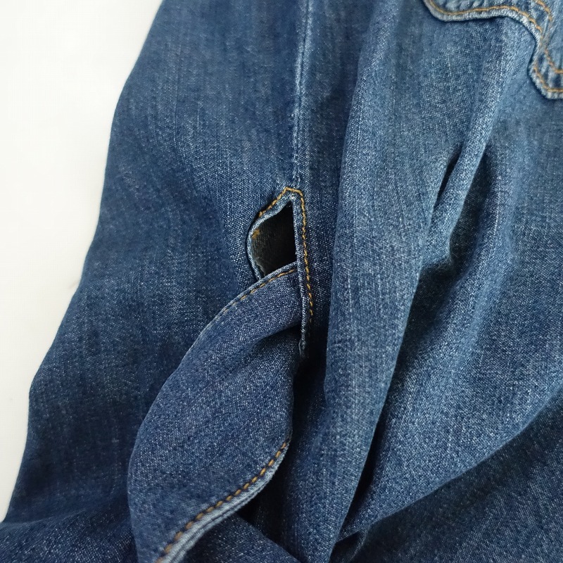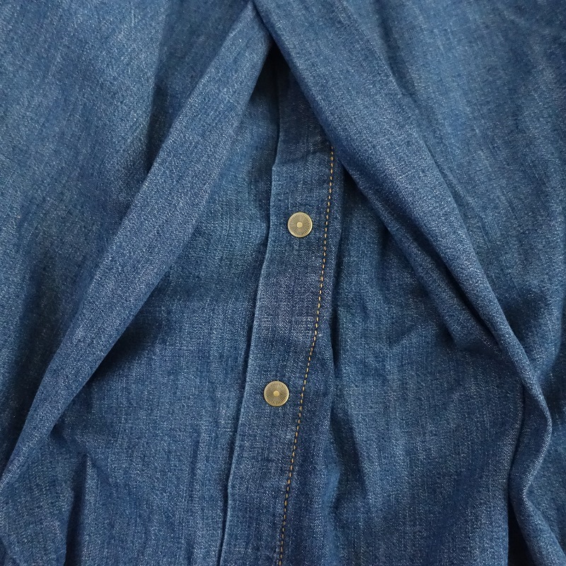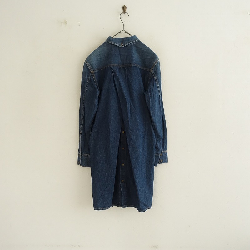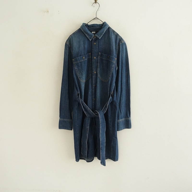 DIESELのコットンデニムシャツワンピースです。カラーはインディゴブルーで、コットンのデニム地で仕立てられています。フロントはスナップボタン開閉で、後ろ中央にスナップボタン付きのスリットがあしらわれ、ウエストにホールが施され、共布のベルトひもが附属しております。 |
