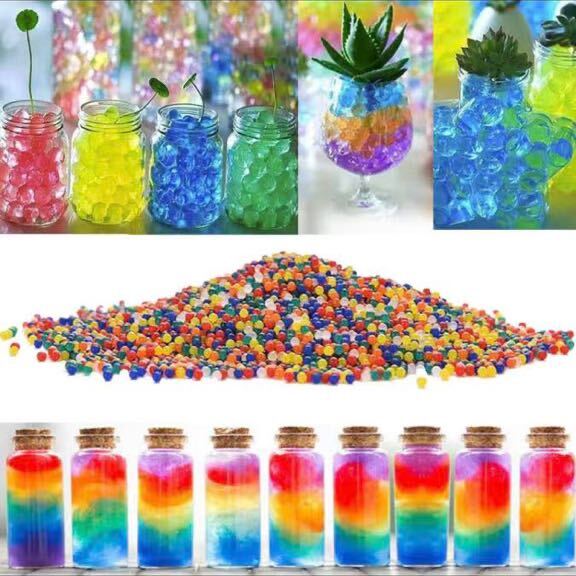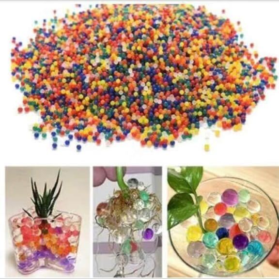小さな粒が水を吸水してジェル状のボールに膨らみます。