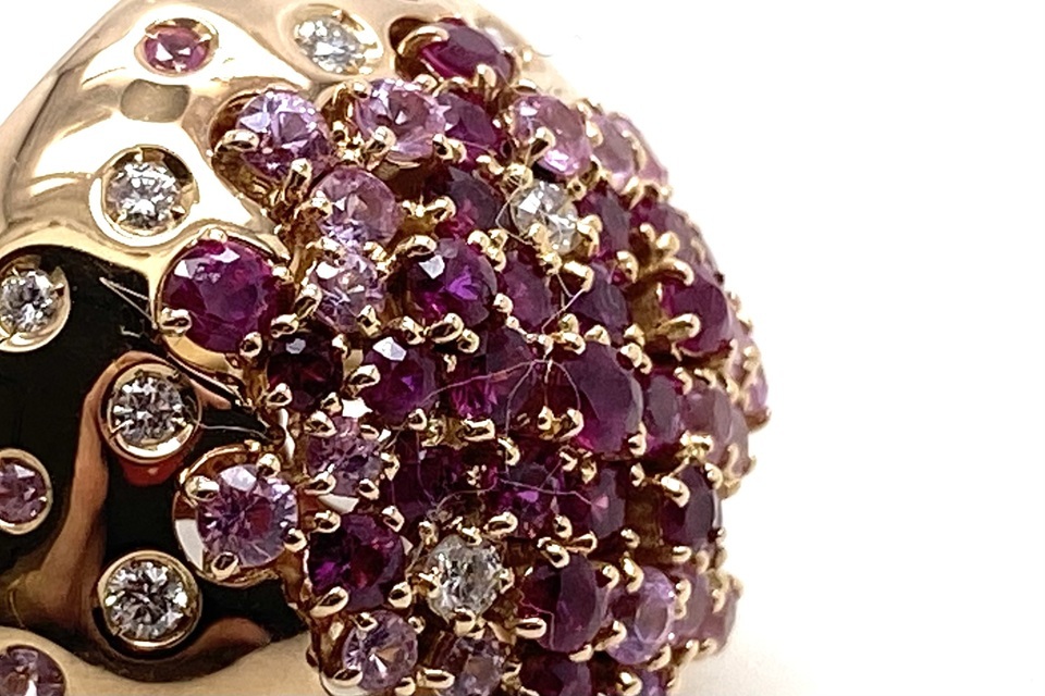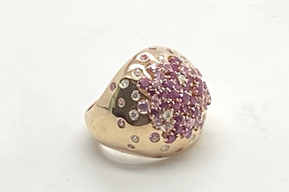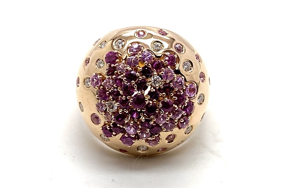 解説 | 星々がバーストしたようにランダムに配された宝石は、いずれも高品質。ボリューミーですが、肌馴染みの良いPG×ドーム状フォルムが優しい雰囲気です。地金と同系色の宝石使いが洗練された印象で、お手元にフェミニンなムードを漂わせます。 |