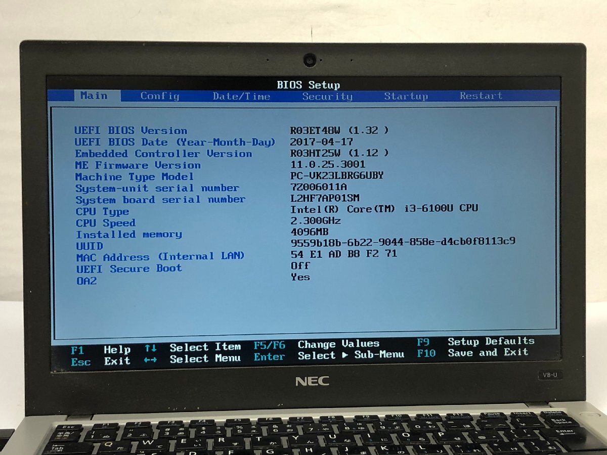 ジャンク/ NEC PC-VK23LBRG6UBY Intel Core i3-6100U メモリ4.1GB ストレージ無し 【K15133】