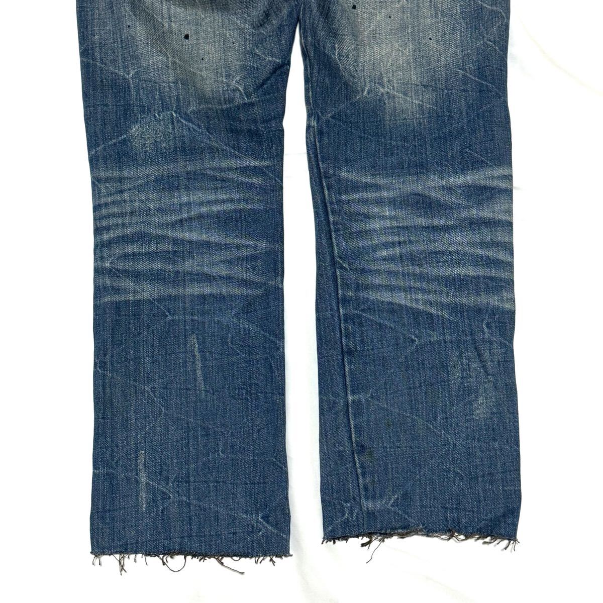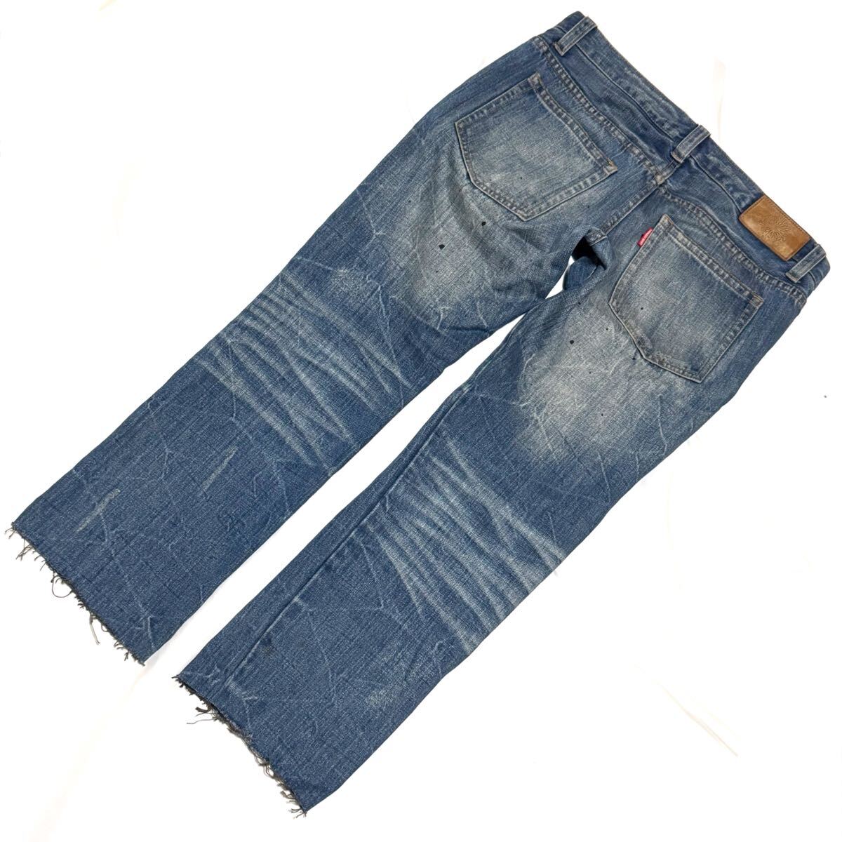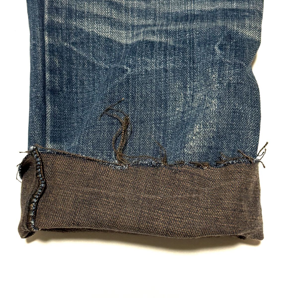 ダメージ加工のあるデザインです。全体的に使用感はありますが、味のある仕上がり。裾のほつれなども含め、ブランド特有のヴィンテージスタイルとしてお楽しみいただけます。