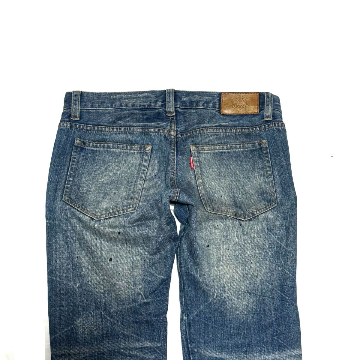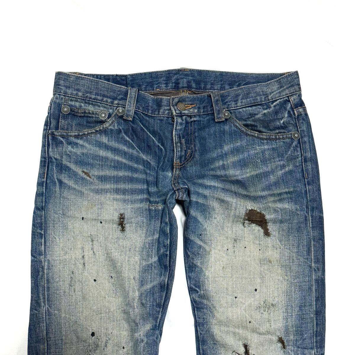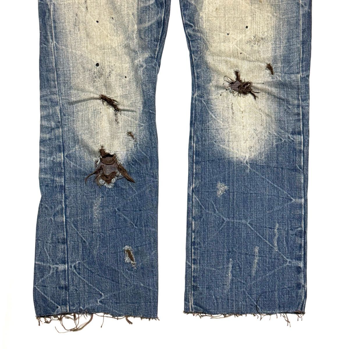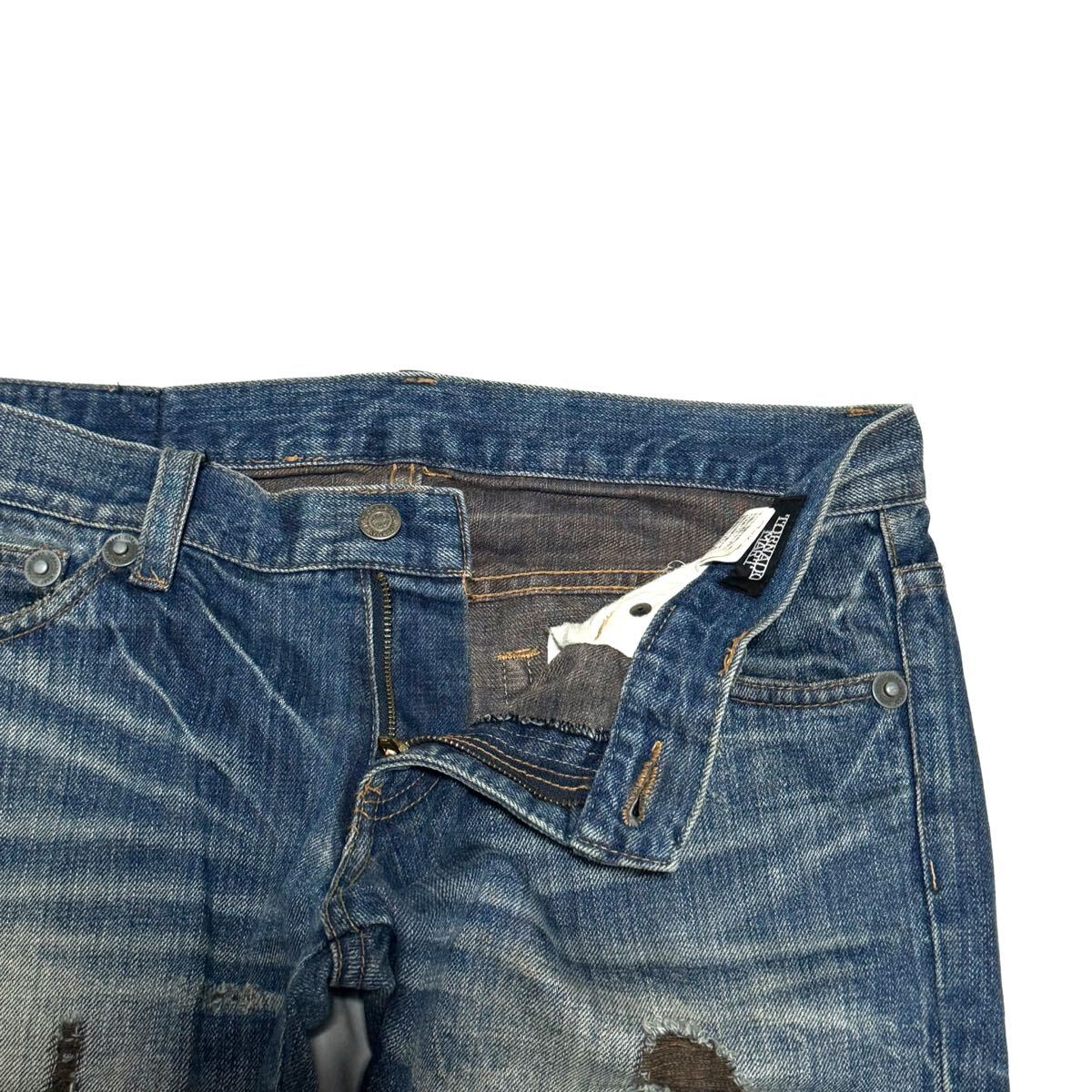 ダメージ加工のあるデザインです。全体的に使用感はありますが、味のある仕上がり。裾のほつれなども含め、ブランド特有のヴィンテージスタイルとしてお楽しみいただけます。
