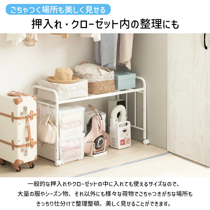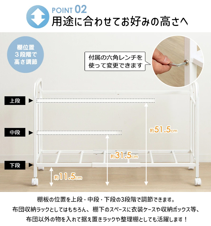棚位置は3段階で調節可能、下に衣装ケースや収納ボックスを置けます。