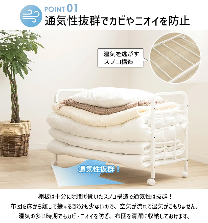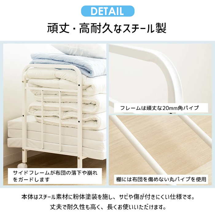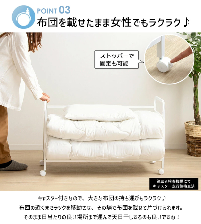 キャスター付きで移動も簡単、布団の上げ下げや持ち運びも楽々。