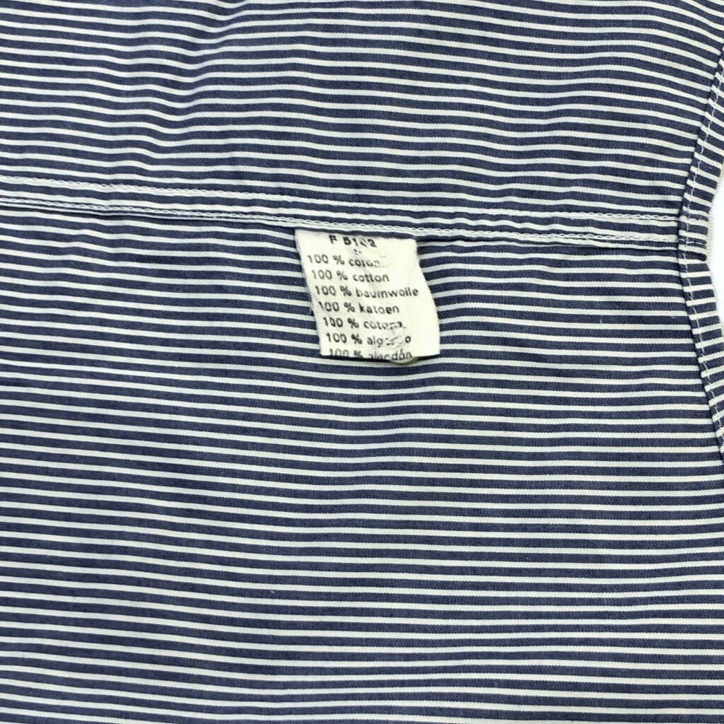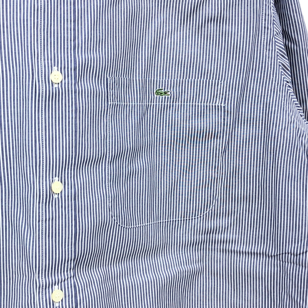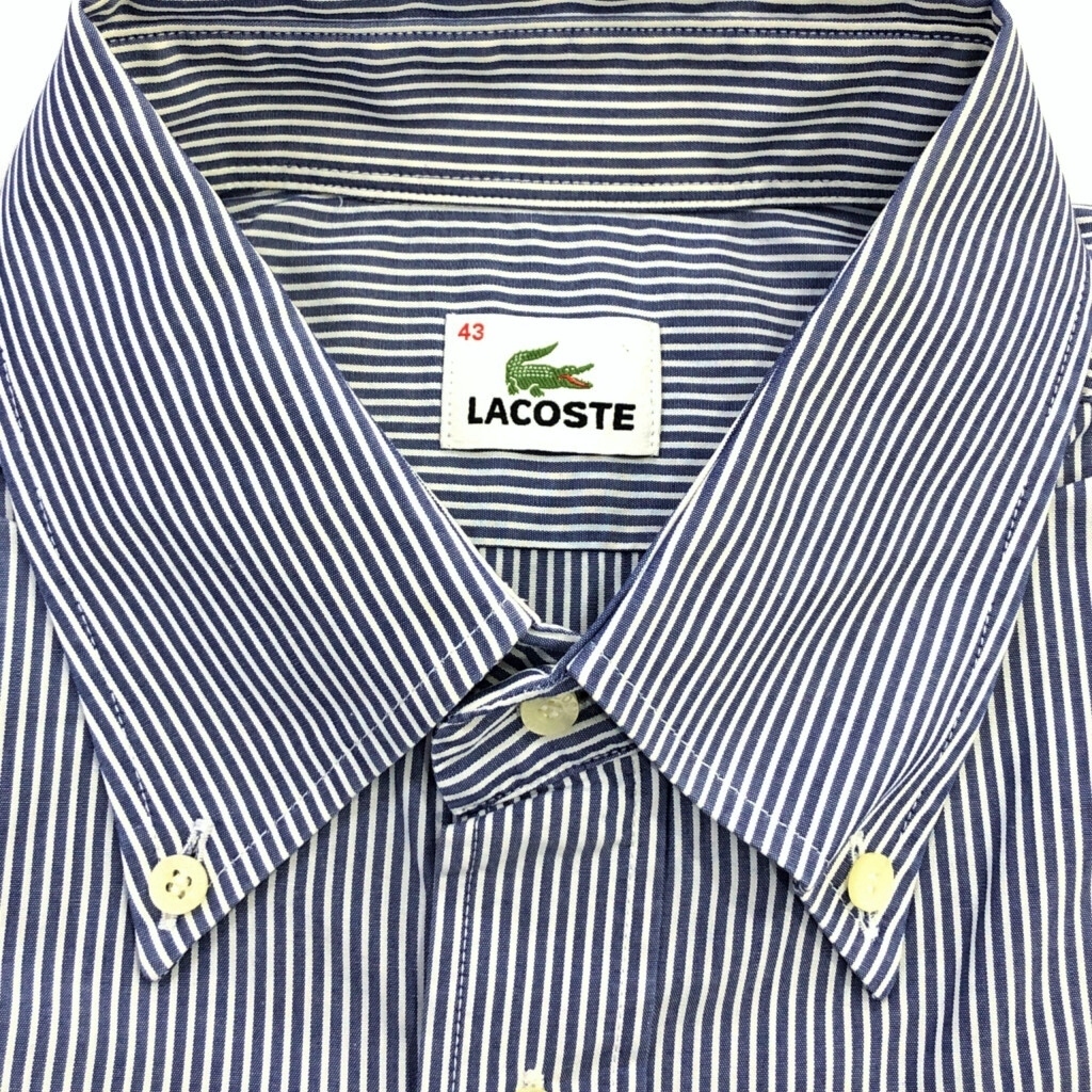 | [商品管理番号] U0200 [ブランド] LACOSTE/ラコステ [サイズ] 43 [実寸サイズ] 肩幅:約50cm 着丈:約82cm 身幅:約63cm 袖丈:約26cm [主な素材] 表地 : コットン [色] ブルー [仕様] ボタンダウン ストライプ [状態] 汚れ:襟 | |||