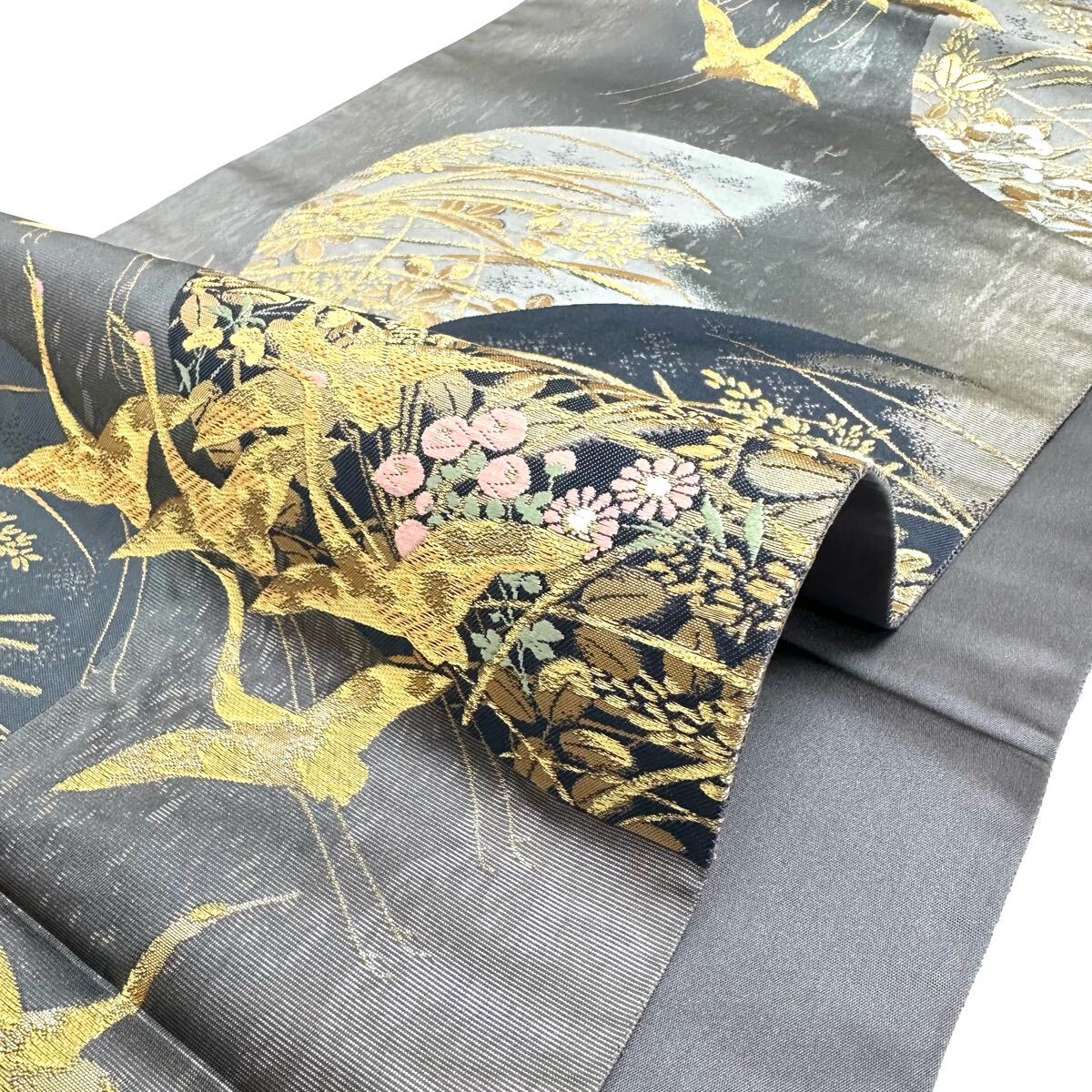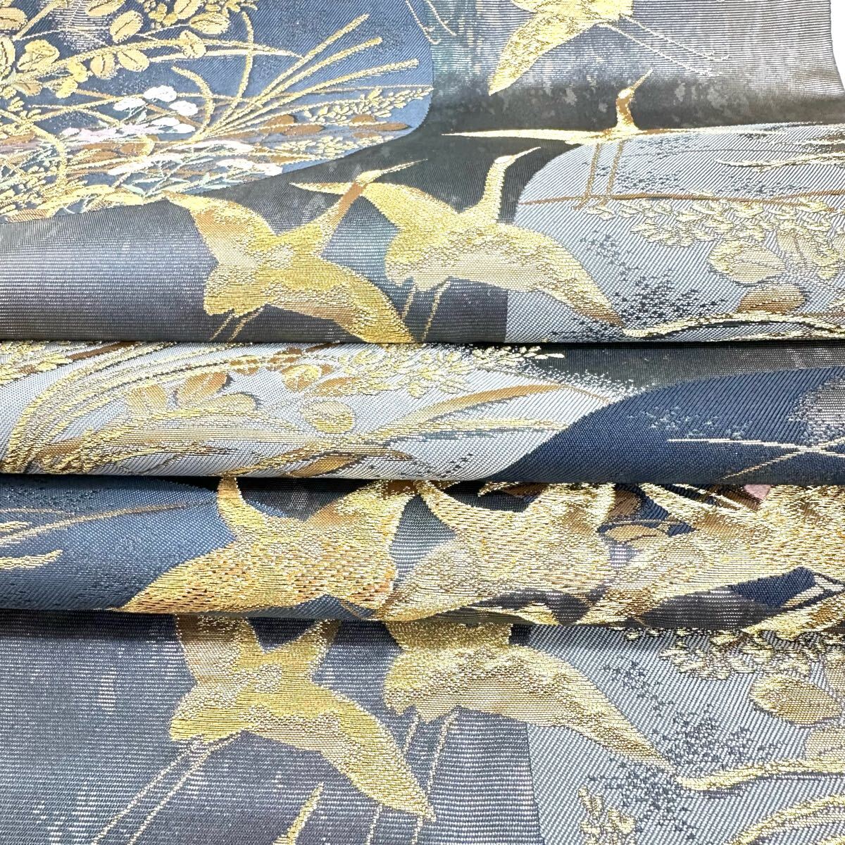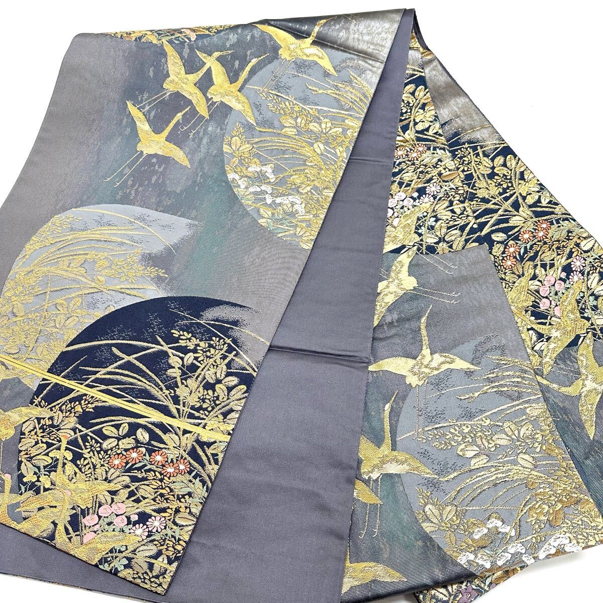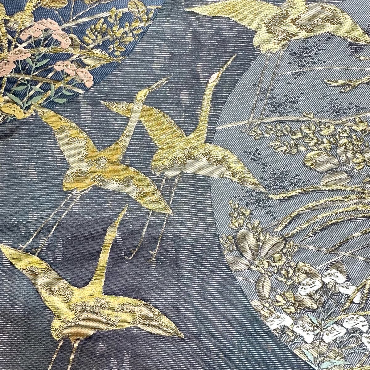 【七福】c556 逸品 高級品 正絹 袋帯 六通 鶴 草花 金糸 刺繍 豪華