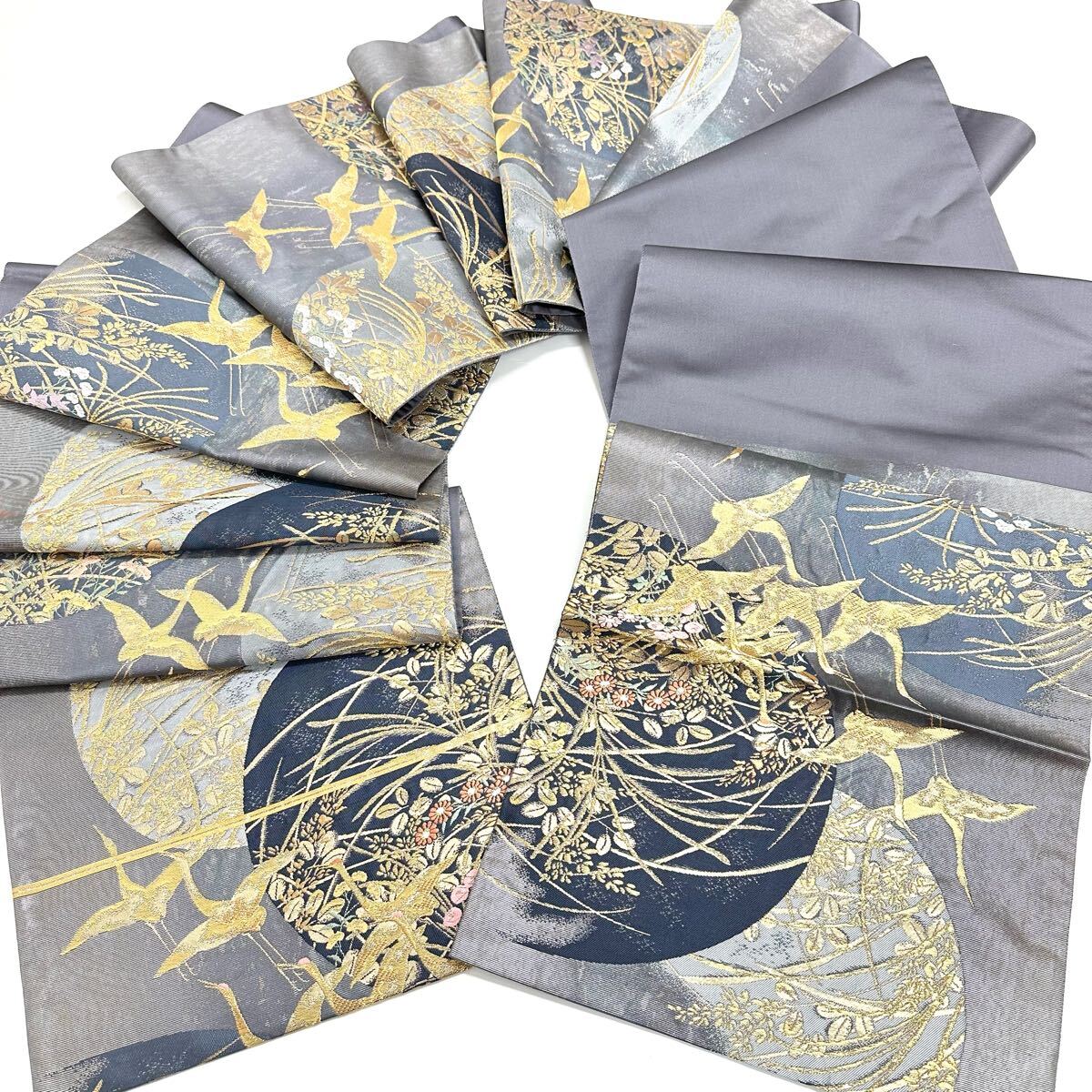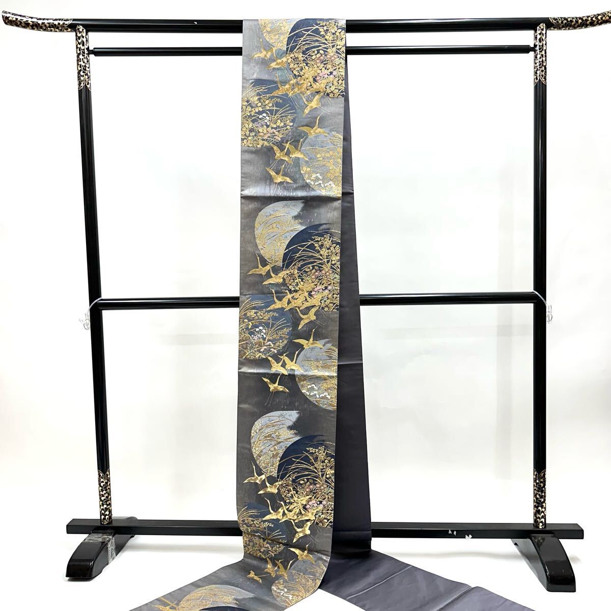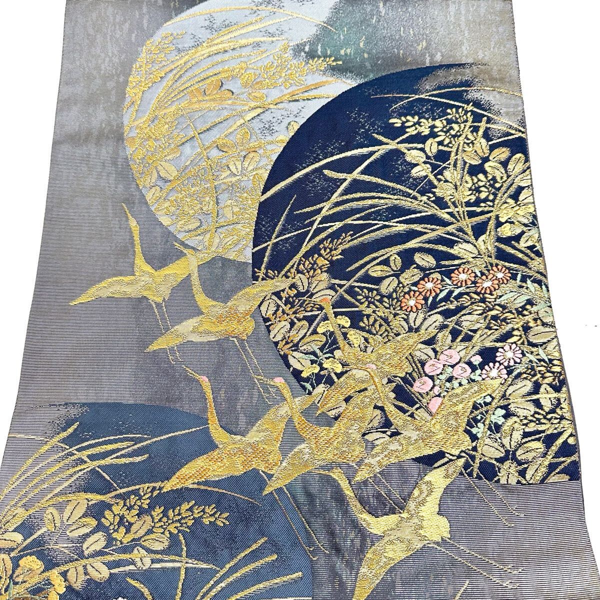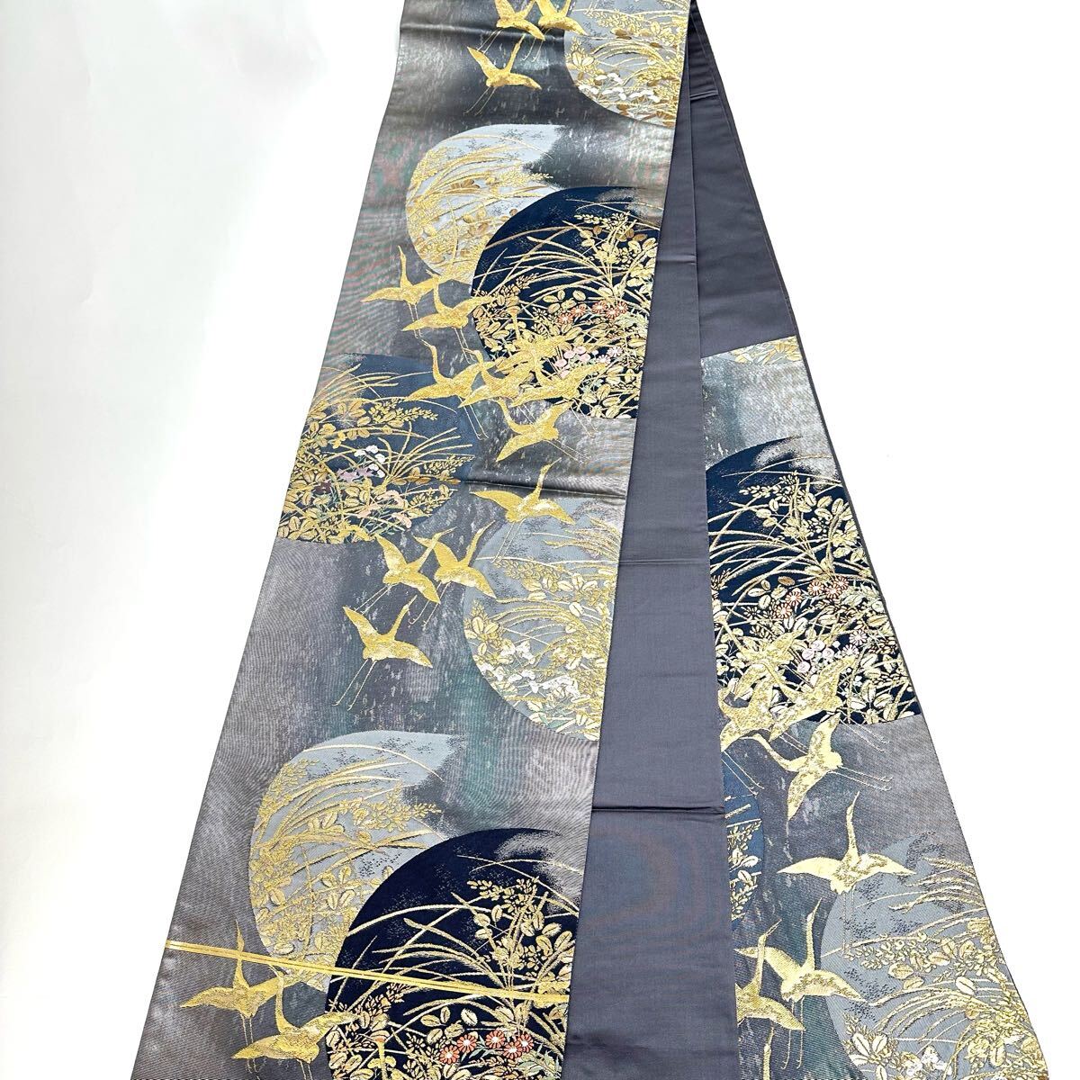 【七福】c556 逸品 高級品 正絹 袋帯 六通 鶴 草花 金糸 刺繍 豪華