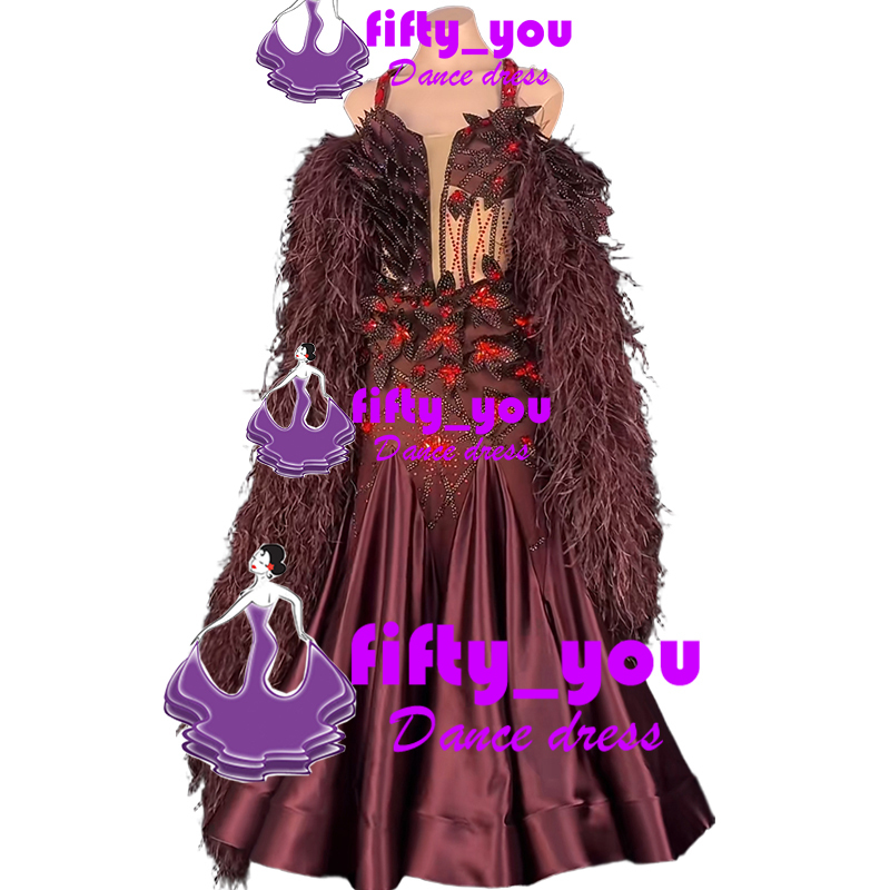 新品fifty_youレディース社交ダンス  モダンドレス 上品ワルツ用ドレス セミオーダー ゴージャスデザイン ボリューム羽フロート
