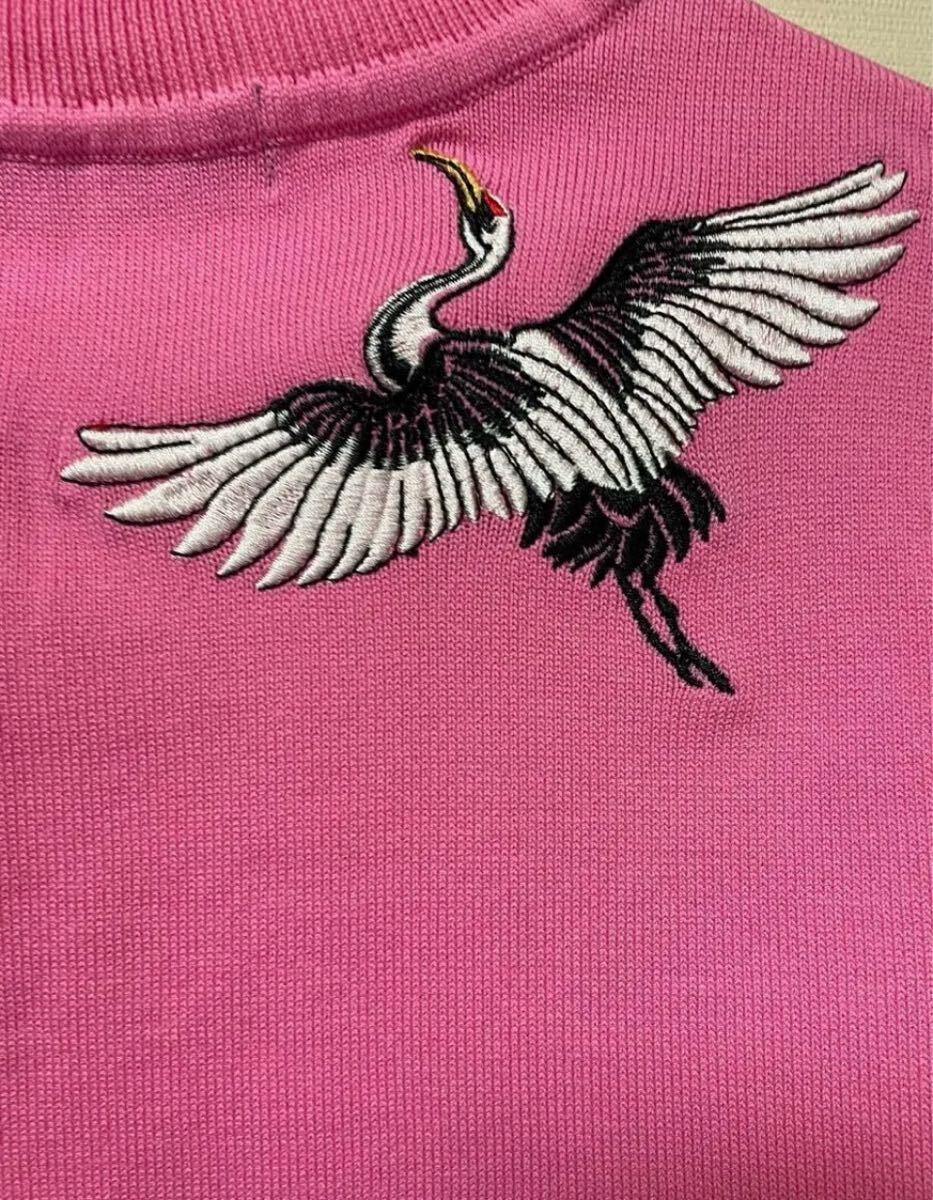 フロントに東京の刺繍、バック刺繍に鶴刺繍でとてもインパクトがあるお品です。