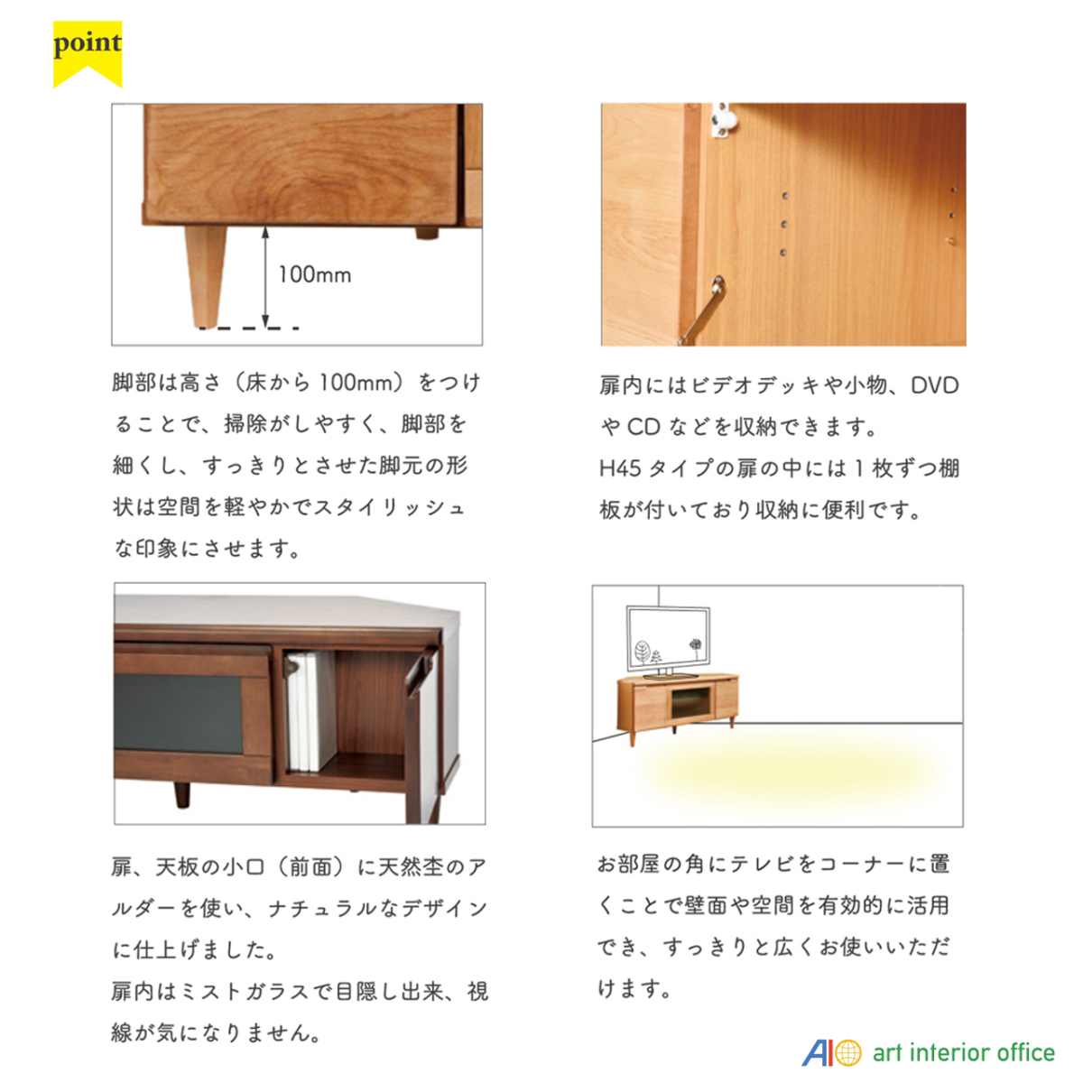 | 商品名 | コーナーTVボード テレビボード テレビ台 天然杢 ナチュラル アルダー無垢材 高さ36cm FIN100LTV-NA |