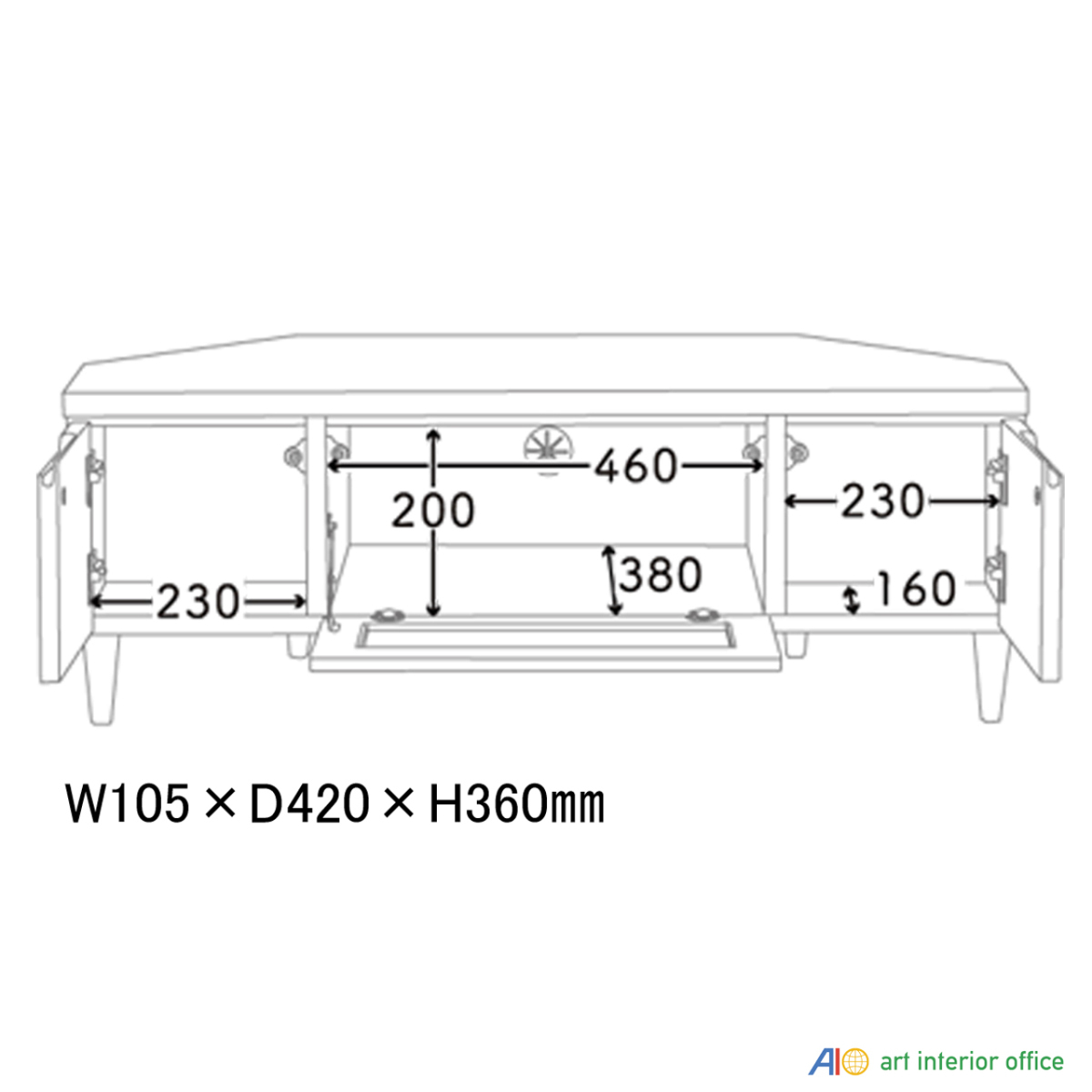 | サイズ | W1005mm×D420mm×H360mm フラップ扉内寸法:幅460mm×奥395mm×高203mm サイド収納部内寸:幅230mm×奥160mm×高203mm 脚高:約100mm |