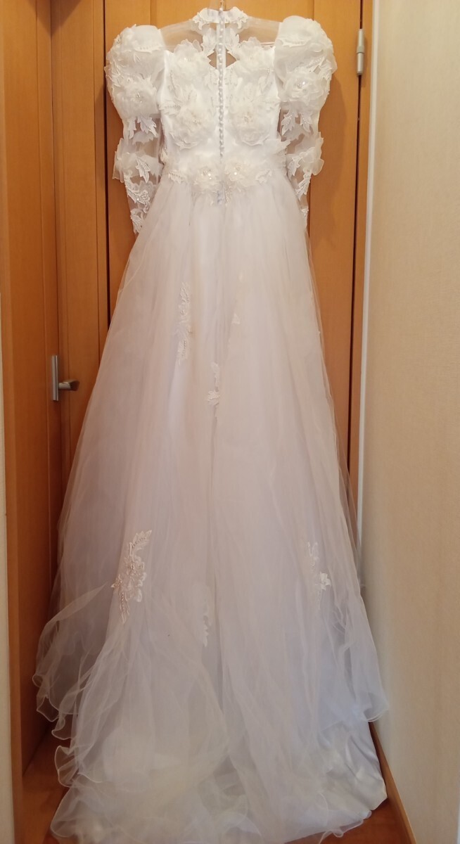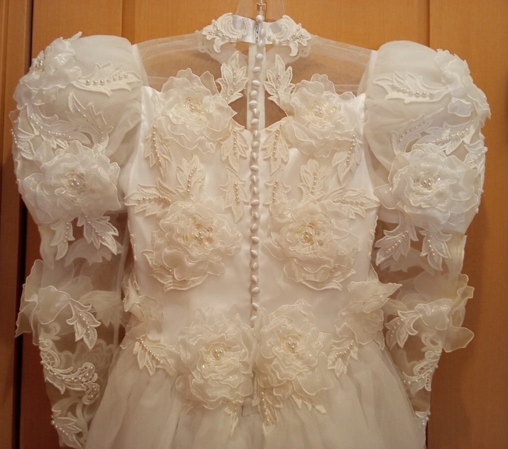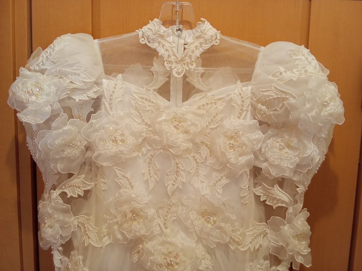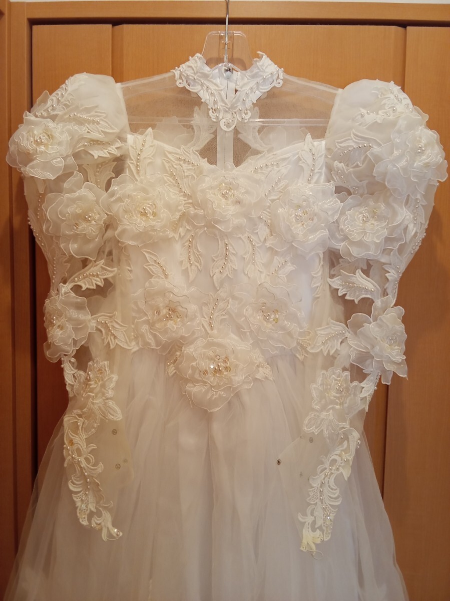 オーガンジーにパールビジューで飾られた、立体的な大輪の薔薇のコサージュ?アップリケ?がふんだんにあしらわれ、ブレードレースなどで飾られた手の込んだお作りの、