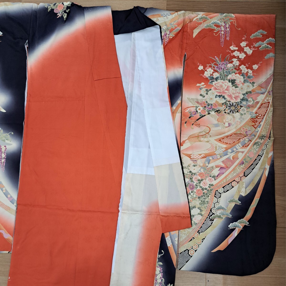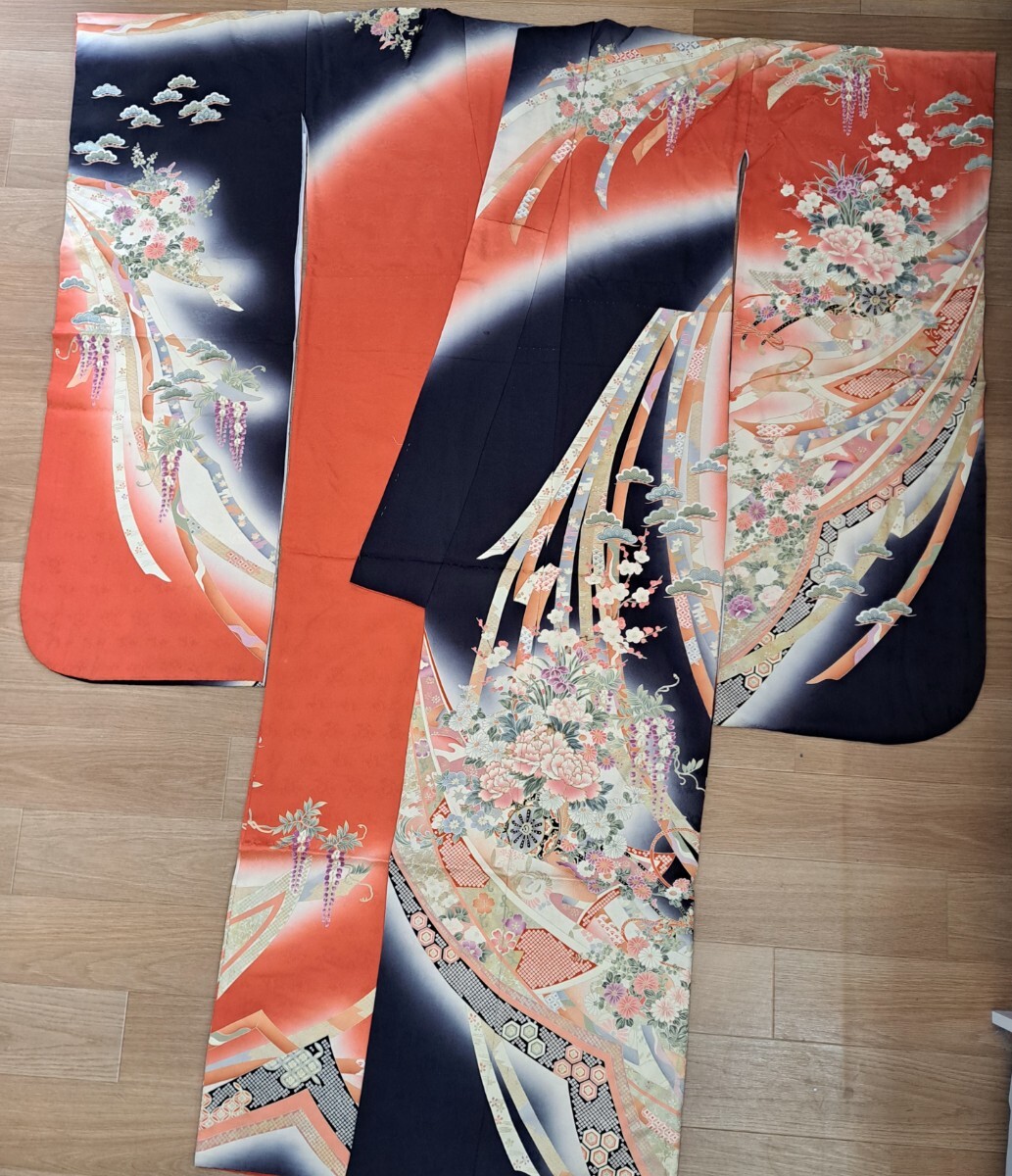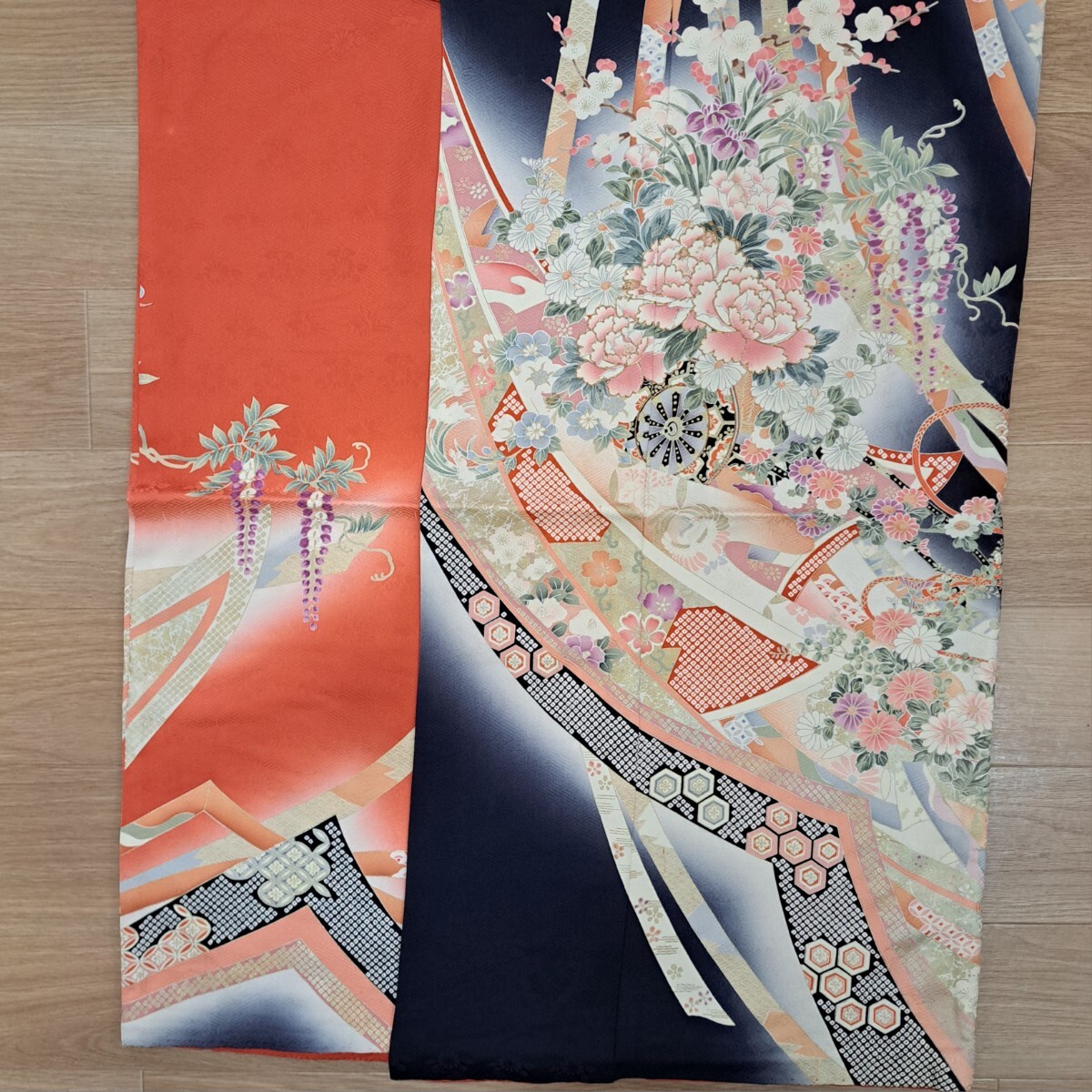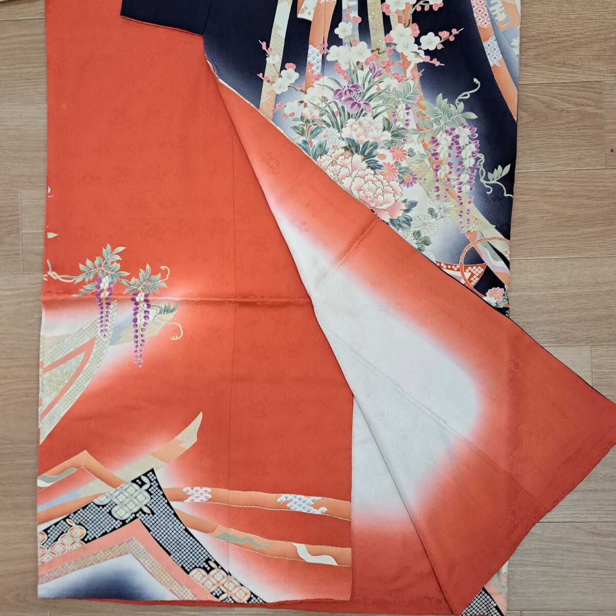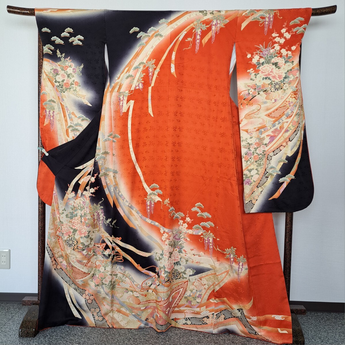 赤地に黒ぼかしを背景にのし柄を流し花車を大胆に描いた明るく豪華な柄です。