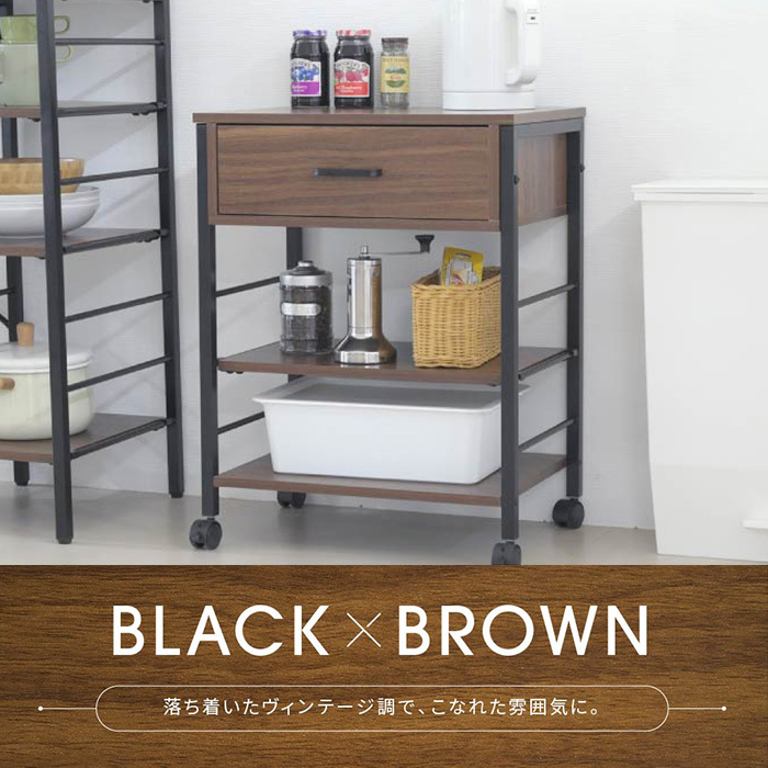 | 幅50cmのキャスターが付いて移動がラクラクキッチンワゴン。 引き出しが1杯付いているので、カトラリーなどのキッチンで使う小物を収納することもできます。 キッチン収納としてだけでなく、デスクサイドに置いてデスクワゴンとしてや、日々使うメイク道具などを収納してコスメワゴンとしても。 |