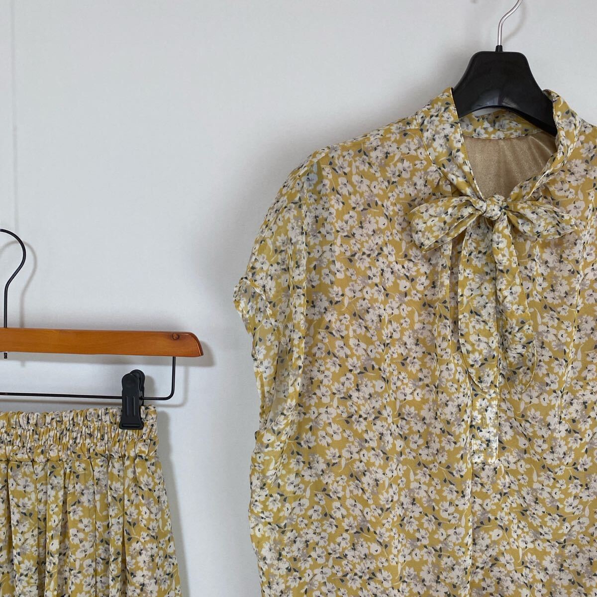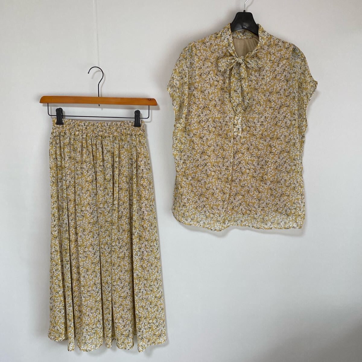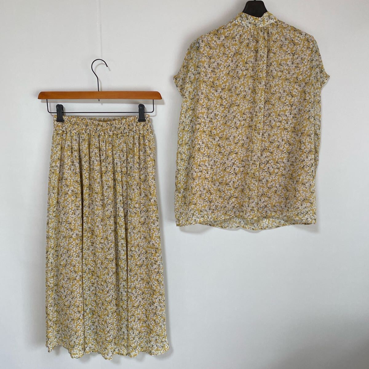MK MICHEL KLEIN(エムケー ミッシェルクラン)のお品です。女性らしさを引き立て、着る人が自信と美しさを感じられるような一着です。パーティー、結婚式にお勧めです。前後2wayで着こなしを楽しめる小花柄タイデザインブラウス(小花柄シフォンブラウス)とフレアスカートです。透け感のあるシフォンで軽やかな印象に。やわらかでいて肌触りのいい素材です。ブラウス身頃にはサテンスムースの裏地付きで透け防止のケアもばっちり、インナーを気にせず着用できます。セットアップでワンピース見えの着こなしも楽しめます。 お色は画像でご確認下さい。実際のお色が良く出ています。薄いイエロー系(黄色系)です。(モデル着用の画像は、着用時のイメージとして掲載しています。)鮮やかな色彩です。背抜き仕立て。フロントに4つボタンが付いています。袖はフレンチスリーブ。ノーベント。ブラウス、ポケット×0。スカート、裏地付き。ウエストゴム。ポケット×0。