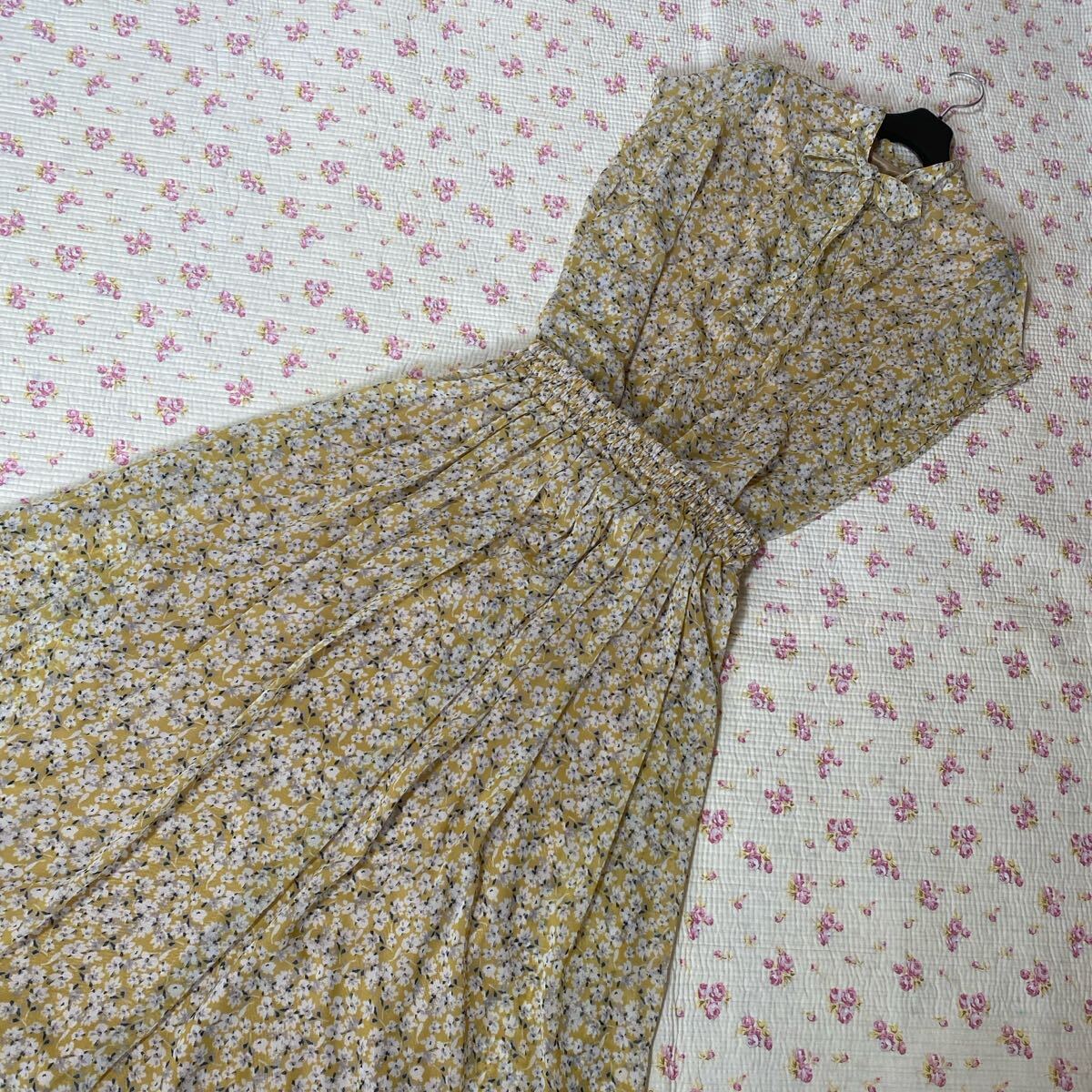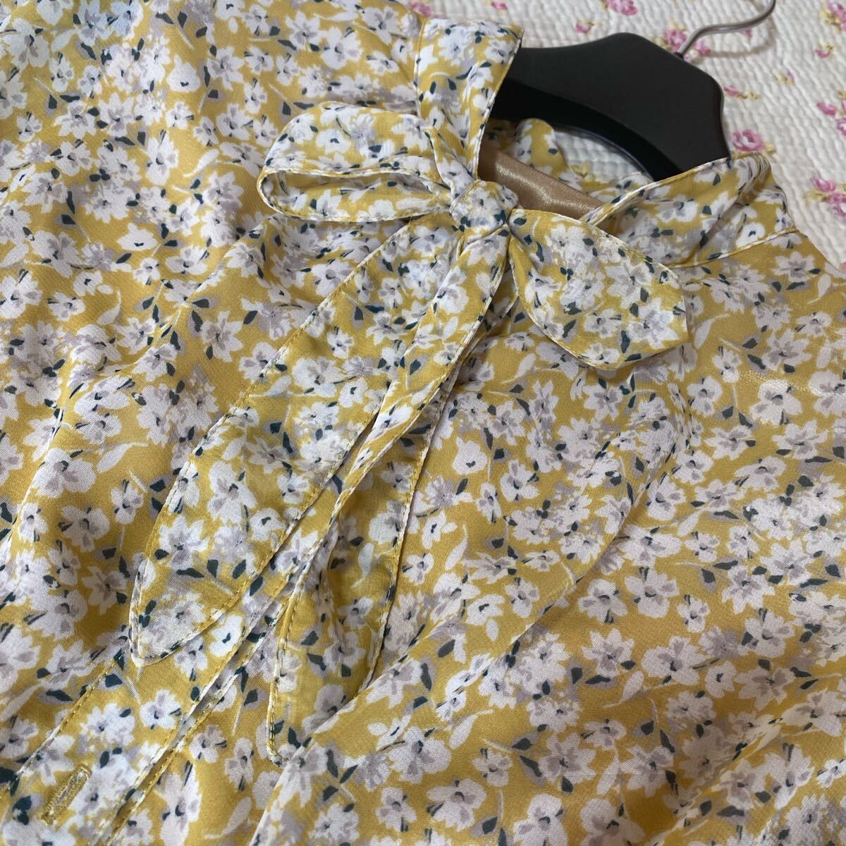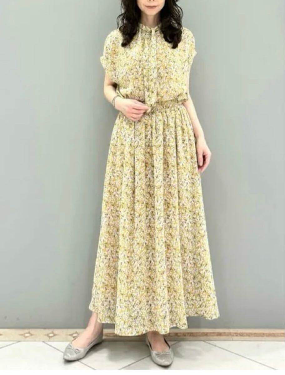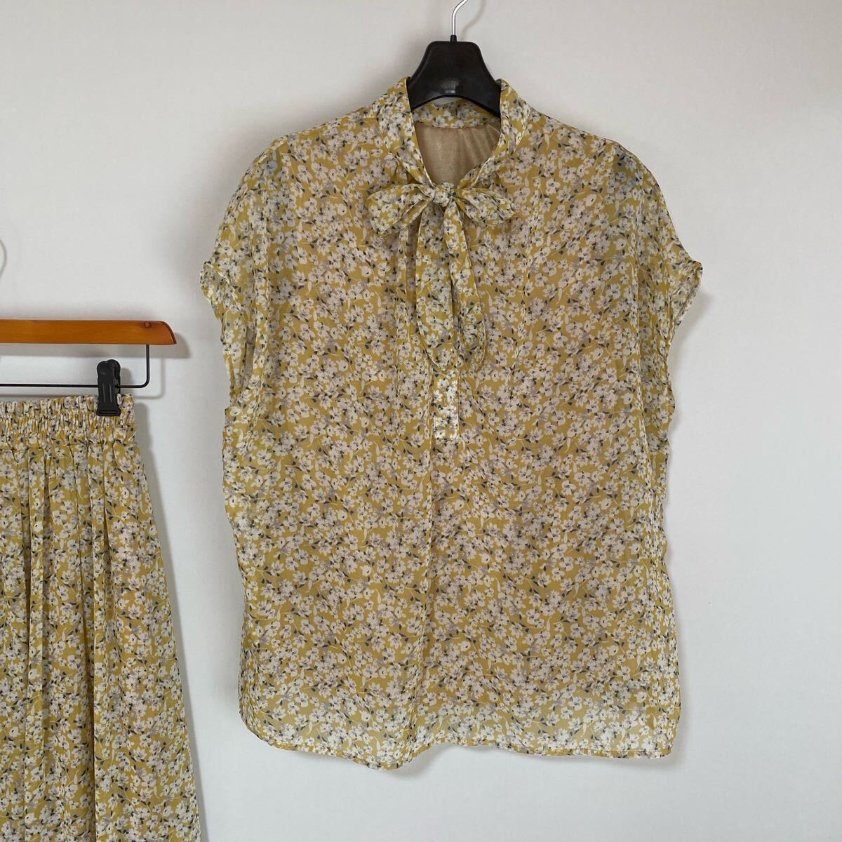 MK MICHEL KLEIN(エムケー ミッシェルクラン)のお品です。女性らしさを引き立て、着る人が自信と美しさを感じられるような一着です。パーティー、結婚式にお勧めです。前後2wayで着こなしを楽しめる小花柄タイデザインブラウス(小花柄シフォンブラウス)とフレアスカートです。透け感のあるシフォンで軽やかな印象に。やわらかでいて肌触りのいい素材です。ブラウス身頃にはサテンスムースの裏地付きで透け防止のケアもばっちり、インナーを気にせず着用できます。セットアップでワンピース見えの着こなしも楽しめます。 お色は画像でご確認下さい。実際のお色が良く出ています。薄いイエロー系(黄色系)です。(モデル着用の画像は、着用時のイメージとして掲載しています。)鮮やかな色彩です。背抜き仕立て。フロントに4つボタンが付いています。袖はフレンチスリーブ。ノーベント。ブラウス、ポケット×0。スカート、裏地付き。ウエストゴム。ポケット×0。