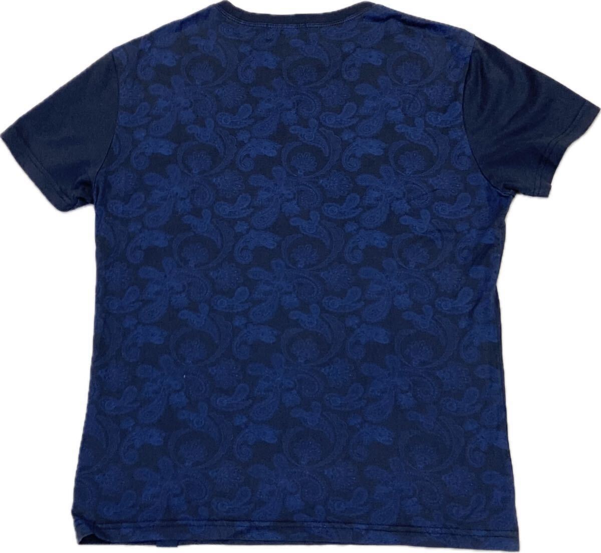 ■クルーネック、ネックリブ編み、袖口・裾ストレート、左前裾にロゴマークワッペン、左胸にブルーのロゴマーク刺繍、背面全体にダークブルーでペイズリープリントがあしらわれたTシャツです。