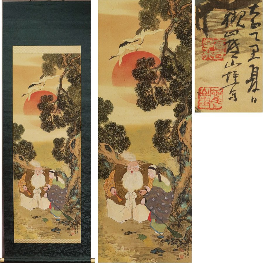 ■商品説明 下記、高倉観崖の手によって、 大正14年(1925年)の夏、75歳の折りに、 独特な筆使いにて趣きのかる表情をした高砂図が描かれた、 大変趣きのある味わい深い作品です。 《 高倉観崖(たかくら かんがい) 》 明治17年(1884年)現在の大分市に生まれる。 本名:孫三郎。通称:宏明。 明治38年(1905年)京都市立美術工芸学校絵画科卒業。 竹内栖鳳・山元春挙らに師事する。 大正 3年(1914年) 第8回文展「鴨川の春」で入選、襃状を受ける。 大正4年(1915年) 第9回文展「密柑」。 大正5年(1916年) 第10回文展「春の遊び」 大正7年(1918年) 第12回文展「浙江所見・水郷春色・宮苑の夏・山寺春色」が入選。 その後画壇を離れ,俳画を描いた。 昭和37年(1962年)没。行年74歳。 ■絹本・肉筆 ■状 態 時代なりのヤケ・薄シミ跡等あり。 ■寸 法 軸寸法/約199.0cm×約66.0cm。 本紙寸法/約141.0cm×約51.0cm。 ■落 款 ご覧の様な銘・落款等あり。 ■箱 箱。 【即決・送料無料】の表示商品に限り、 一部地域(北海道・沖縄)を除き、送料無料キャンペーンを実施しております。 ご希望の方は、お早めに入札して頂けます様、宜しくお願い致します。 【※※なお、作品に対して疑問や質問がある場合には、※※】 質問欄もしくは、ストア情報に当方の情報が記載されておりますので、こちらをクリックしてお問い合わせ下さい。 宜しくお願い致します。 |