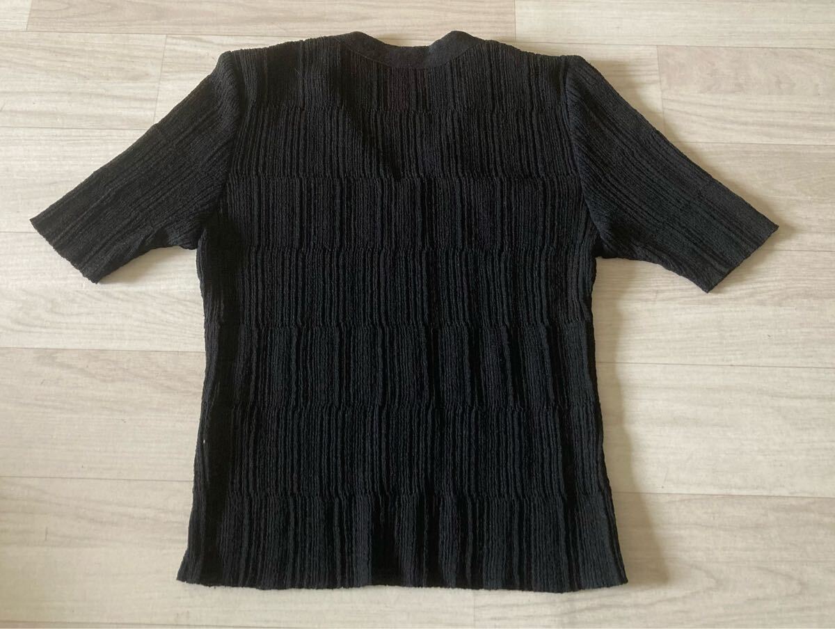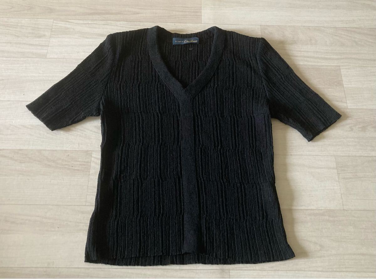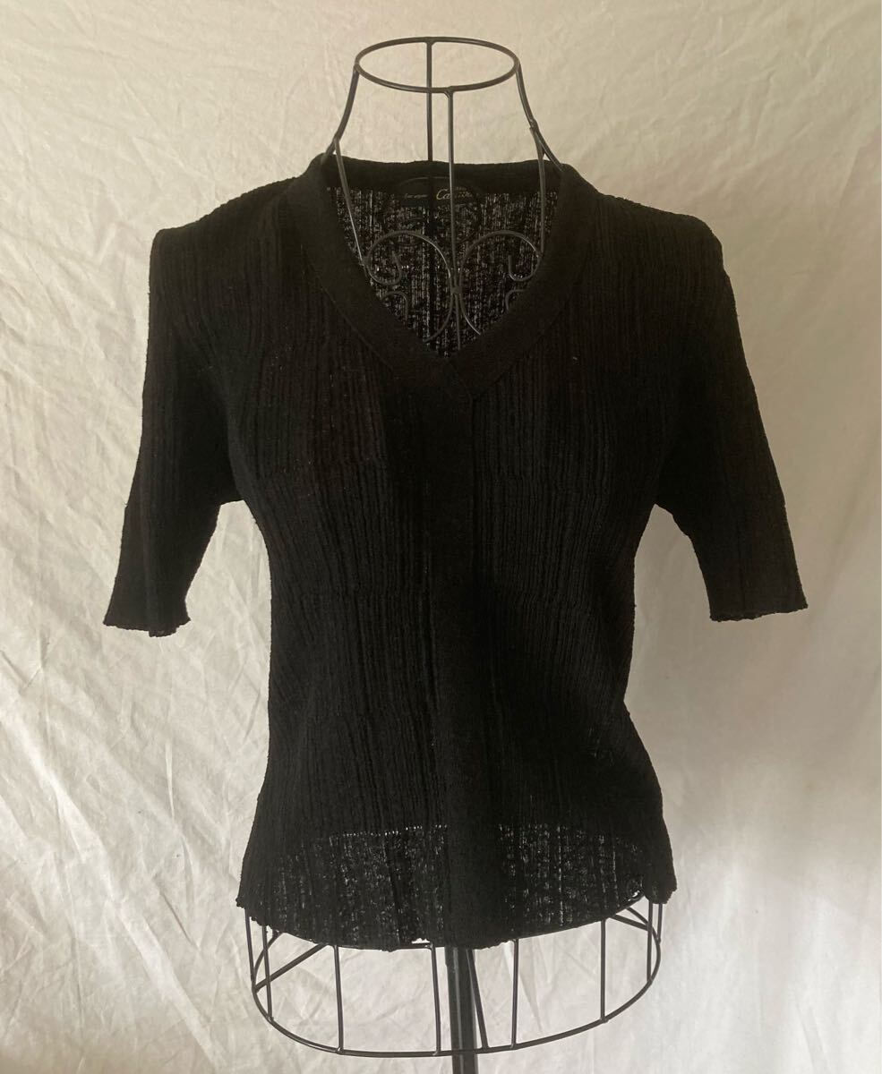 Caravan透け感のあるリブ編みの黒いVネック半袖トップス。半袖カットソー
