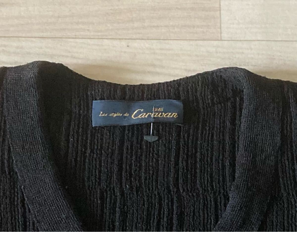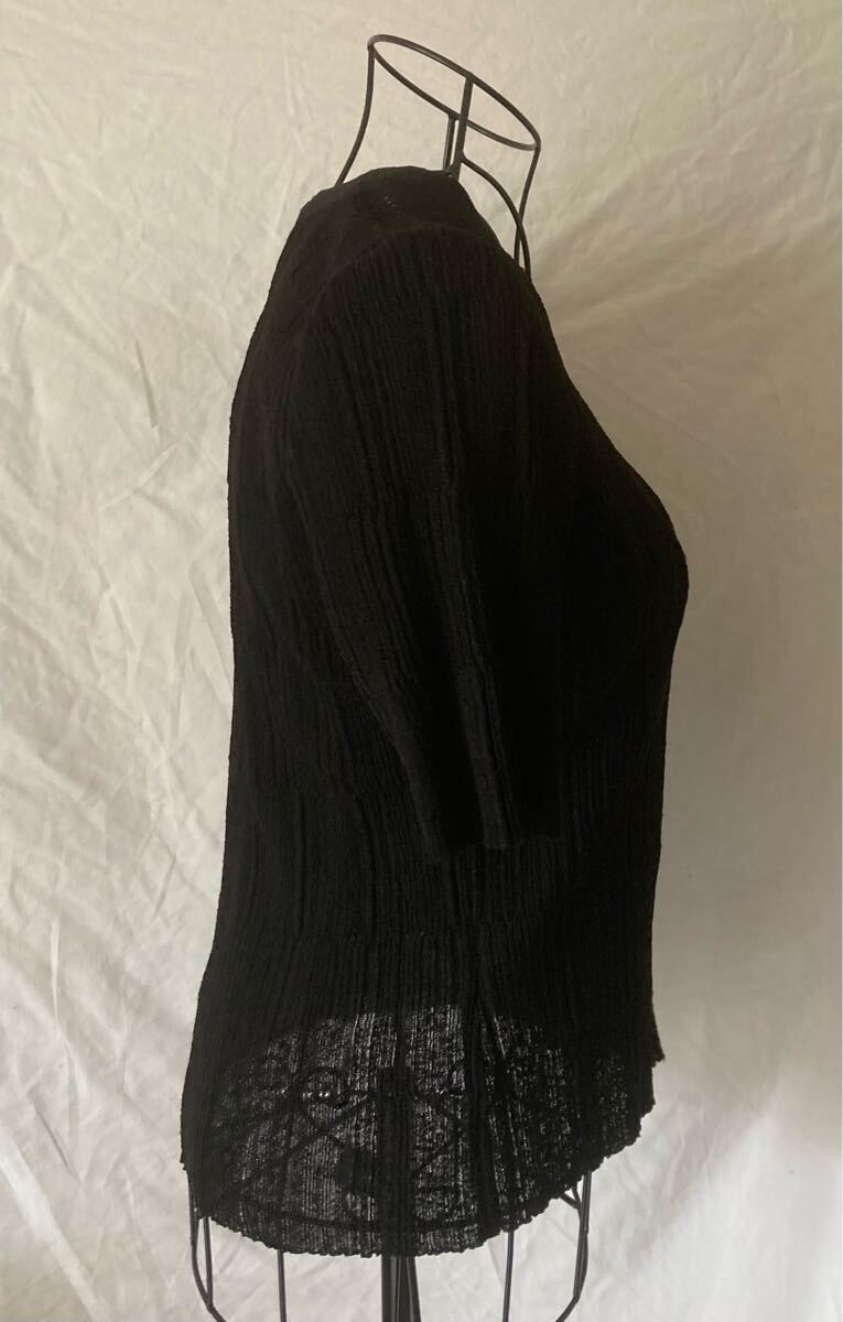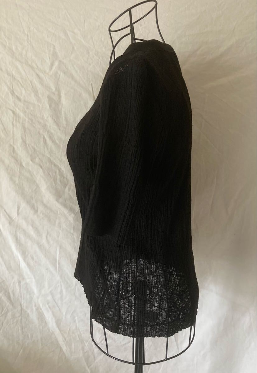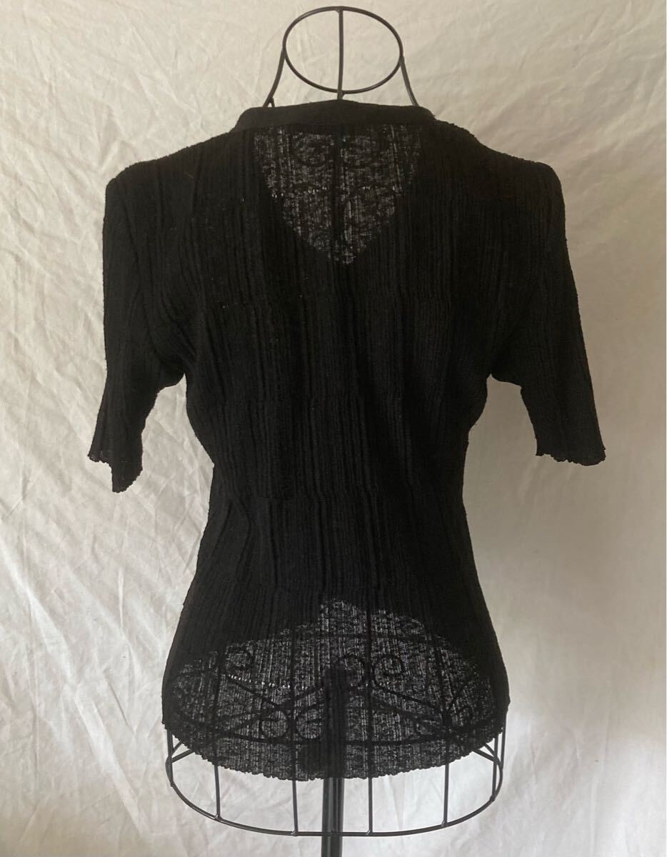 Caravan透け感のあるリブ編みの黒いVネック半袖トップス。半袖カットソー