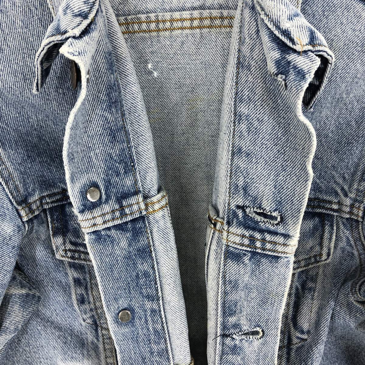 着用感: メンズM 表記サイズ: 不明 着丈: 60cm 身幅: 52cm 肩幅: 47cm 袖丈: 64cm ![]() | ![]() ランク:C USEDデニムですので使用感、擦れ、色落ちなどございますが、まだまだご愛用していただけます。 古着という事をご理解の上ご注文よろしくお願いします。 【状態追記】 ●全体に汚れ・擦れ ●前、左袖先に糸抜け ●後、右袖先に糸抜け |