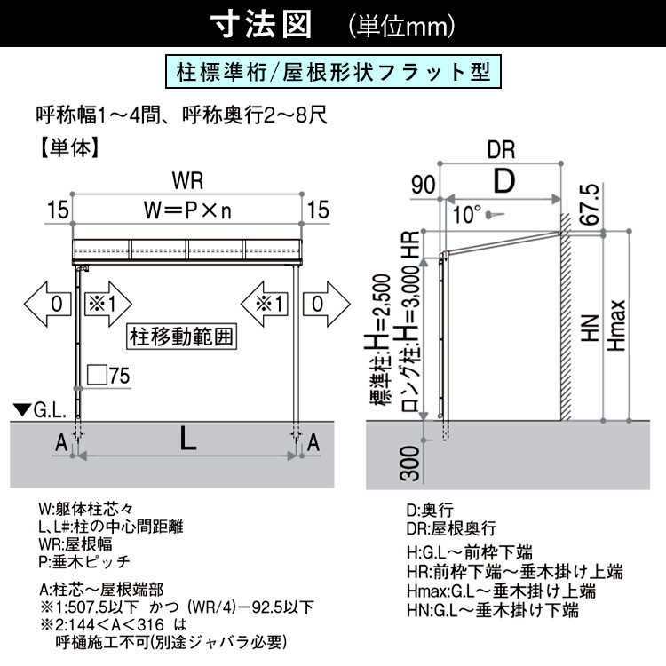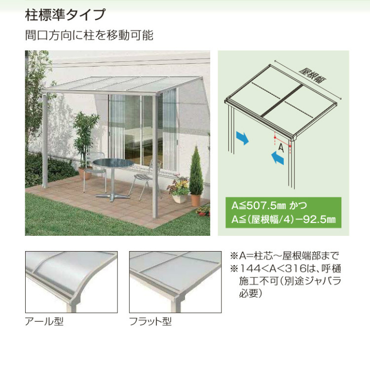 | サイズ | 間口:1.0間(屋根外寸1,850mm) 出幅:7尺(出幅寸法2,070mm) 標準柱:高さ2,500mm Hmax(地面からテラス屋根本体の一番上まで):2,997.4mm |
