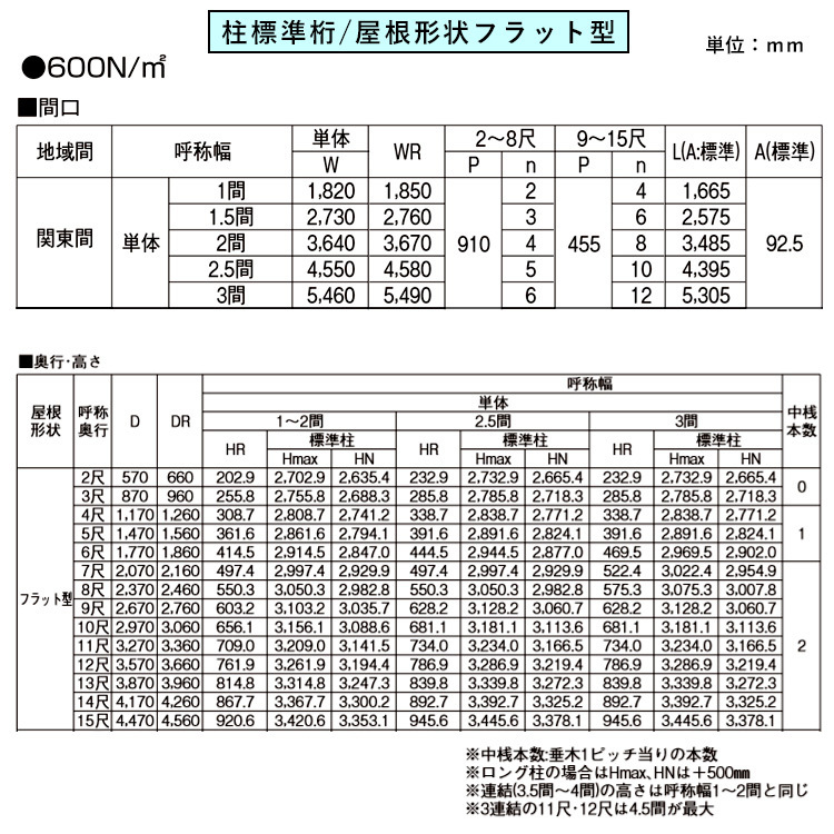 | 特徴 | 柱:標準桁タイプ 積雪性能:20cm(600N/平方メートル) 耐風圧性能:風速Vo36m/s相当 |