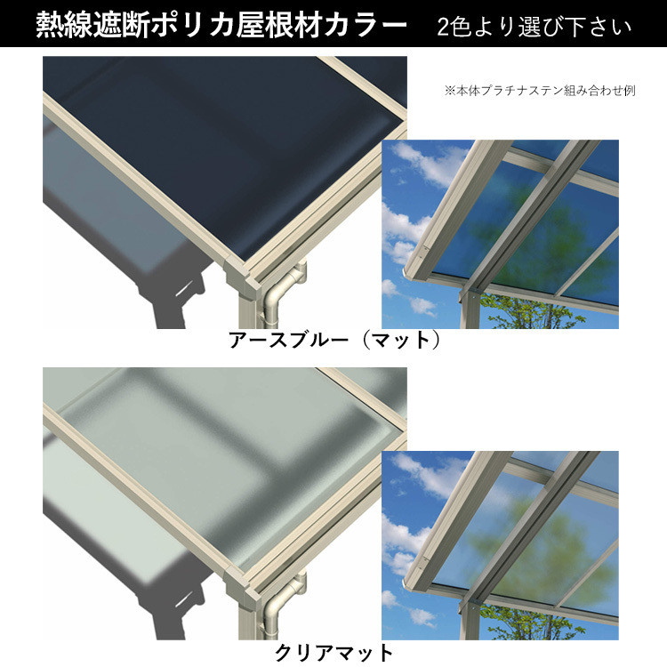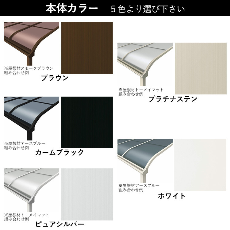| カラー | ▼本体カラー(全5色) ブラウン、カームブラック、プラチナステン、ピュアシルバー、ホワイト ▼熱線遮断ポリカ屋根材カラー(全2色) アースブルー(マット)、クリアマット |