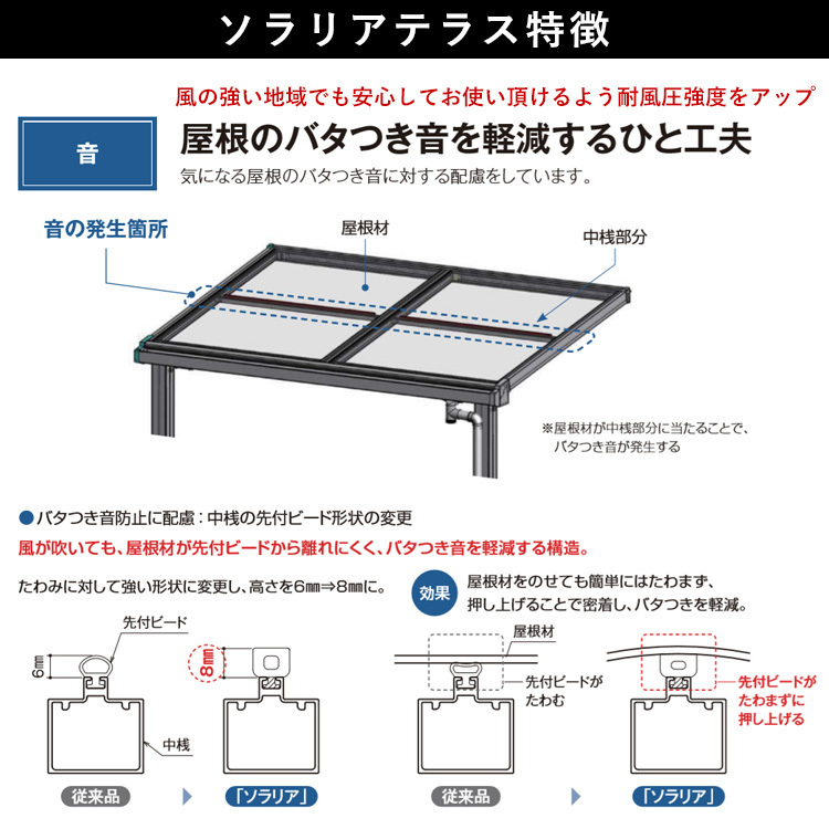 | 説明 | YKK APアルミテラス屋根シリーズ ソラリア ■安心の基本性能 ・雨や風の強い地域でも安心してお使い頂ける耐風圧性能 ・風による屋根のバタつき音を軽減 ■優れた施工性でDIYにもオススメ ・屋根は全スパン下から施工 ・使用するねじは4種類のみ 新築/新居の外構工事の施主支給品として 今住んでいるお家(住宅)にあるベランダ屋根の交換/リフォーム ウッドデッキに設置して天気に左右されない 子供の遊び場やアウトドア・BBQ、憩いのスペースに |