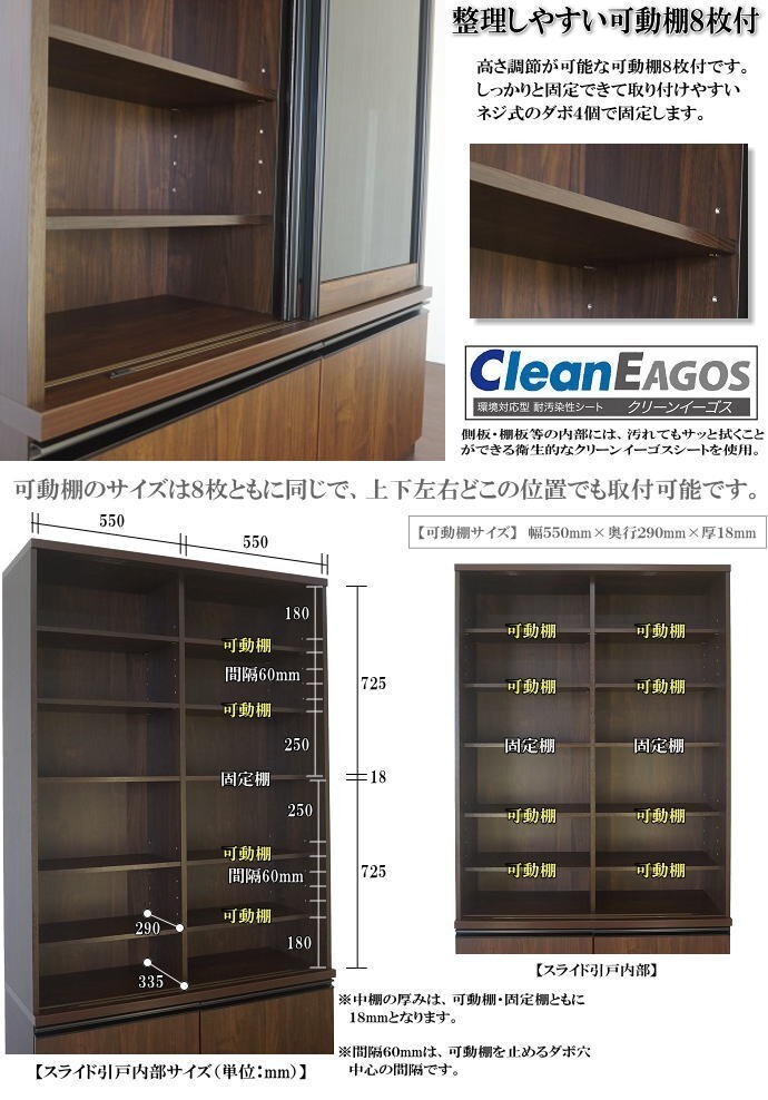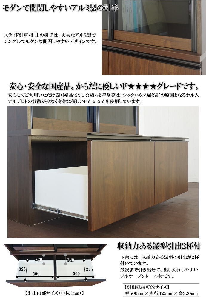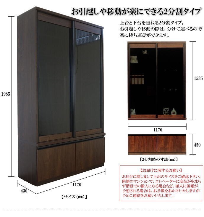 | 【商品説明】 | ※安心・安全の国産品です。 【材質について】 ●繊維板・パーティクルボードおよび接着剤はF★★★★グレードで、塗料はホルムアルデヒドを含みません。 ●表面材にはウォールナット柄の強化シートを使用し、落ち着きと高級感があります。 ●側面・本体内部には、汚れてもサット拭ける「クリーンイーゴスシート」を使用しています。 ●スライド引戸は、ブラック色のスモーク強化ガラスを使用し、中が見え難くなっています。 【機能について】 ●Y字型のアルミレールと静音の戸車を使用した、なめらかで静かな滑りのフェザームーブ仕様のスライド扉です。 ●高さ調節が可能な可動棚8枚付です。しっかりと固定できて取り付けやすいネジ式のダボ4個で固定します。可動棚のサイズは8枚ともに同じで、上下左右どこの位置でも取付可能です。 ●スライド引戸・引出の引手は、丈夫なアルミ製です。シンプルでモダンな開閉しやすいデザインです。 ●下台には、収納力ある深型の引出が2杯付いています。最後まで引き出せて、出し入れしやすいフルオープンレール付です。 ●上台と下台を重ねる2分割タイプ。お引越しや移動の際は、分けて運べるので楽に持ち運びができます。 | |