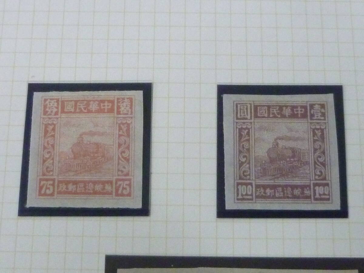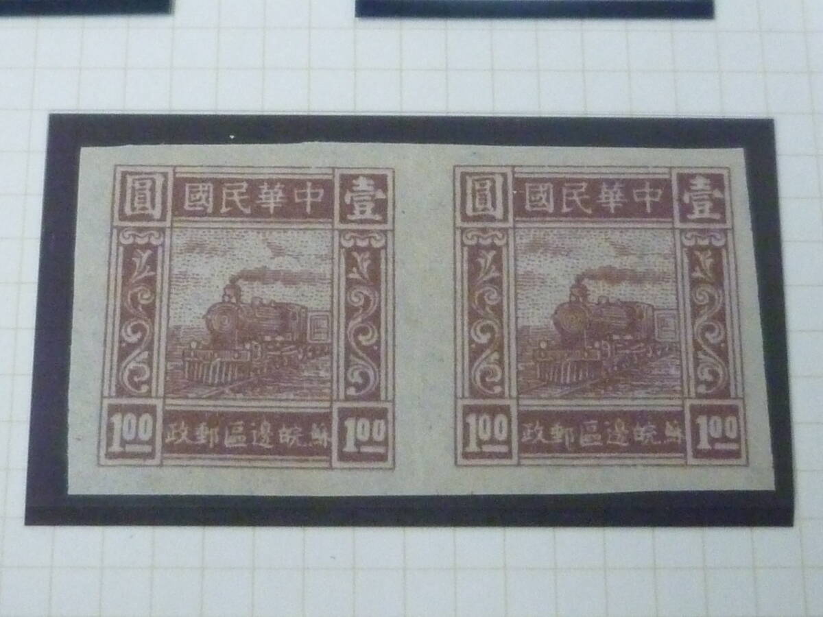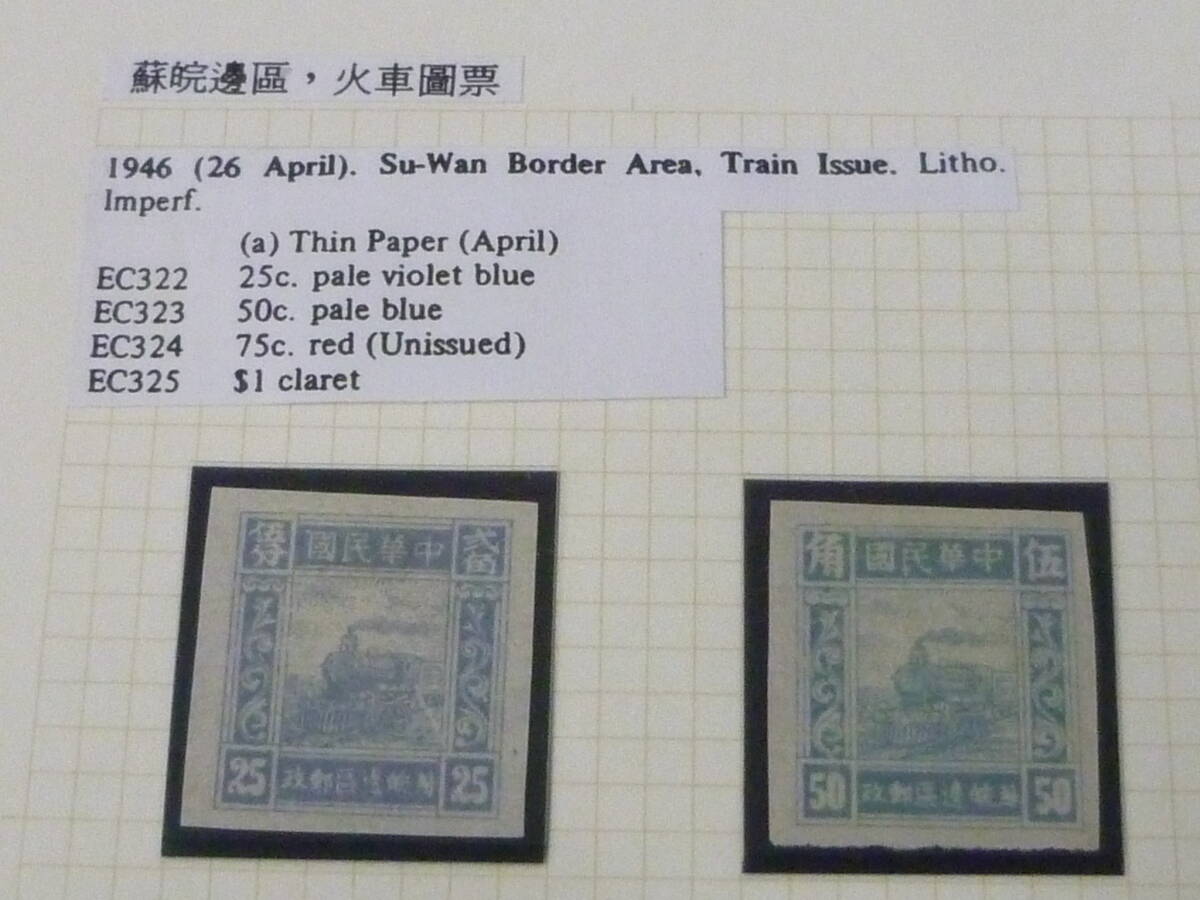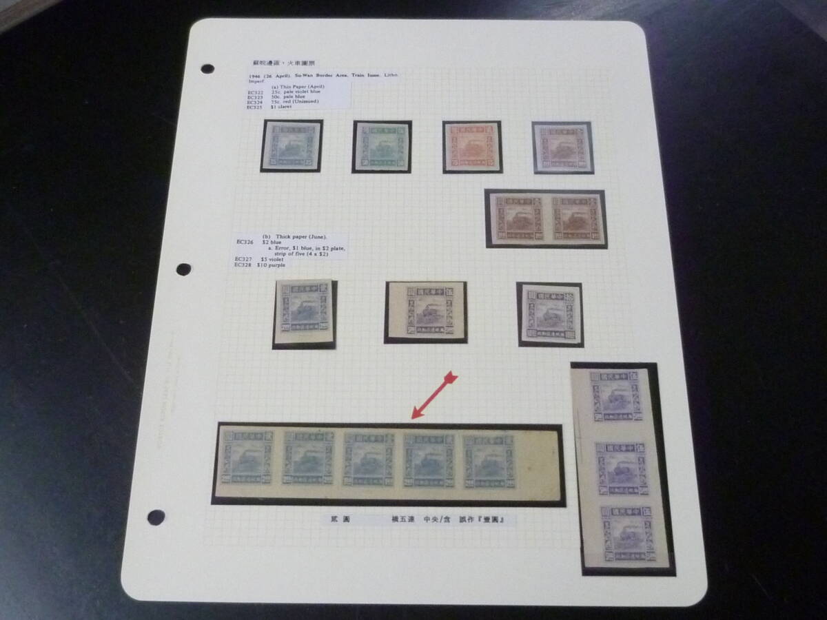 鉄道№5 中国解放区切手 1946年 華東区 蘇皖邊区・火車図 無目打 バラエティー含 計7種完 9枚+5枚連刷+3枚連刷 未使用OH・VF