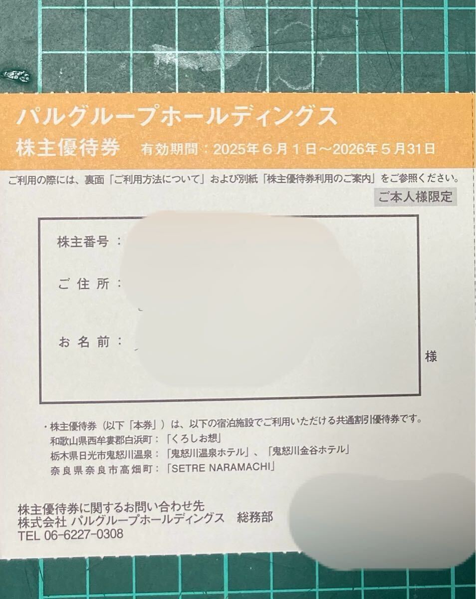 最新2026.5.31迄 株式会社パルグループホールディングス 株主優待券 1枚(1枚につき1泊4名様迄)男性名義