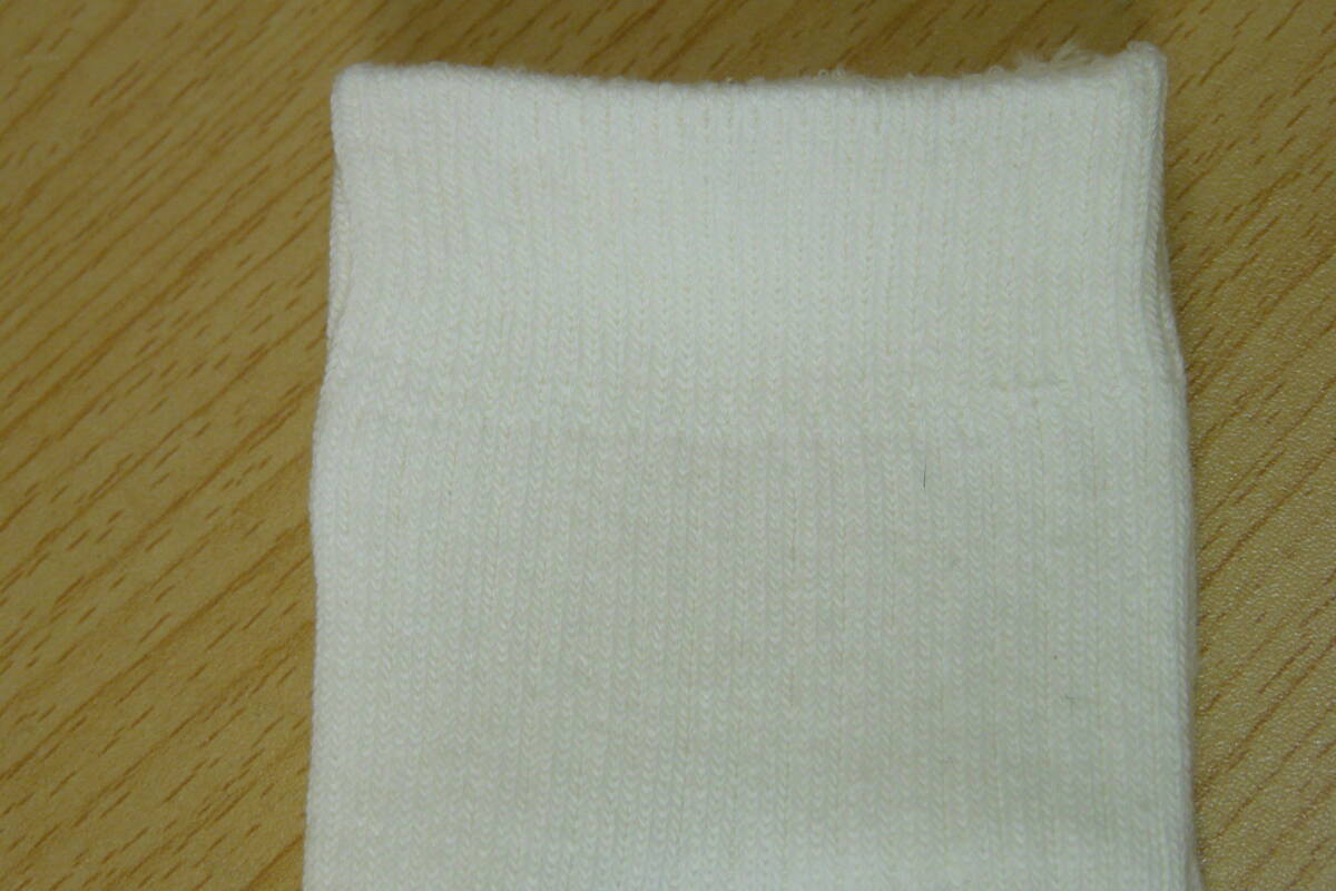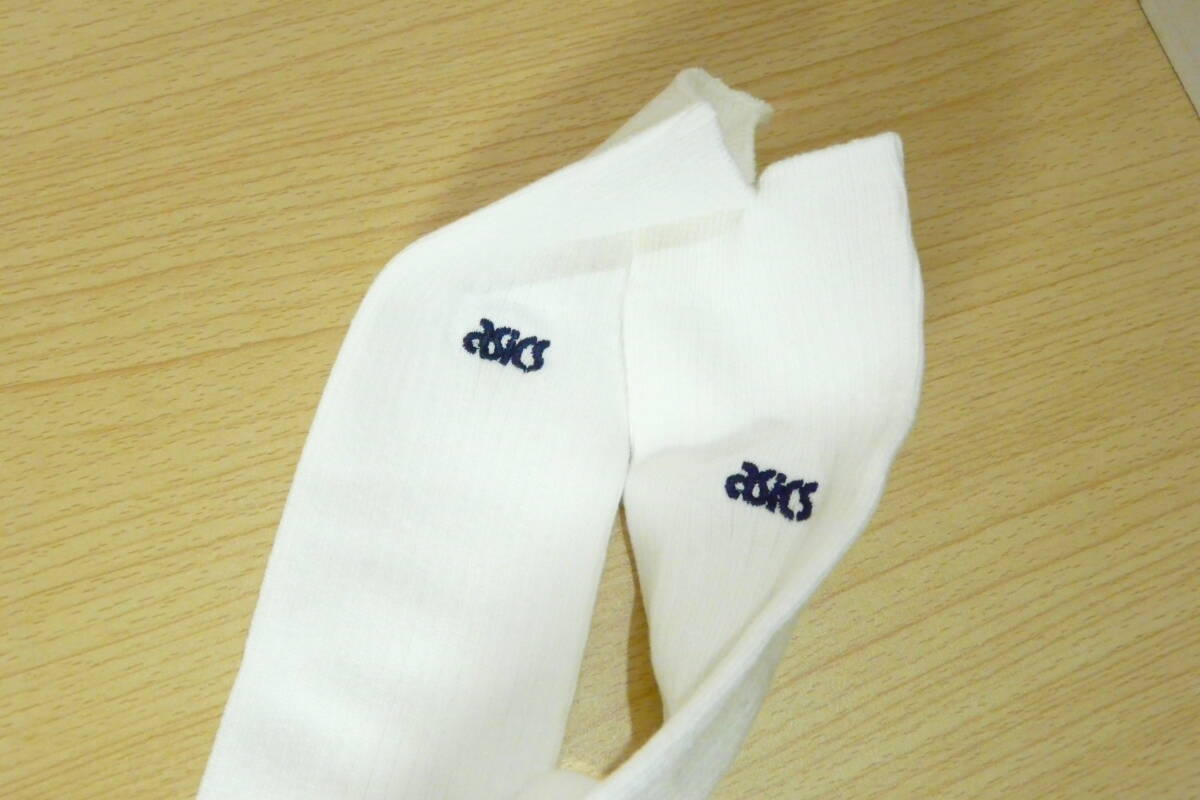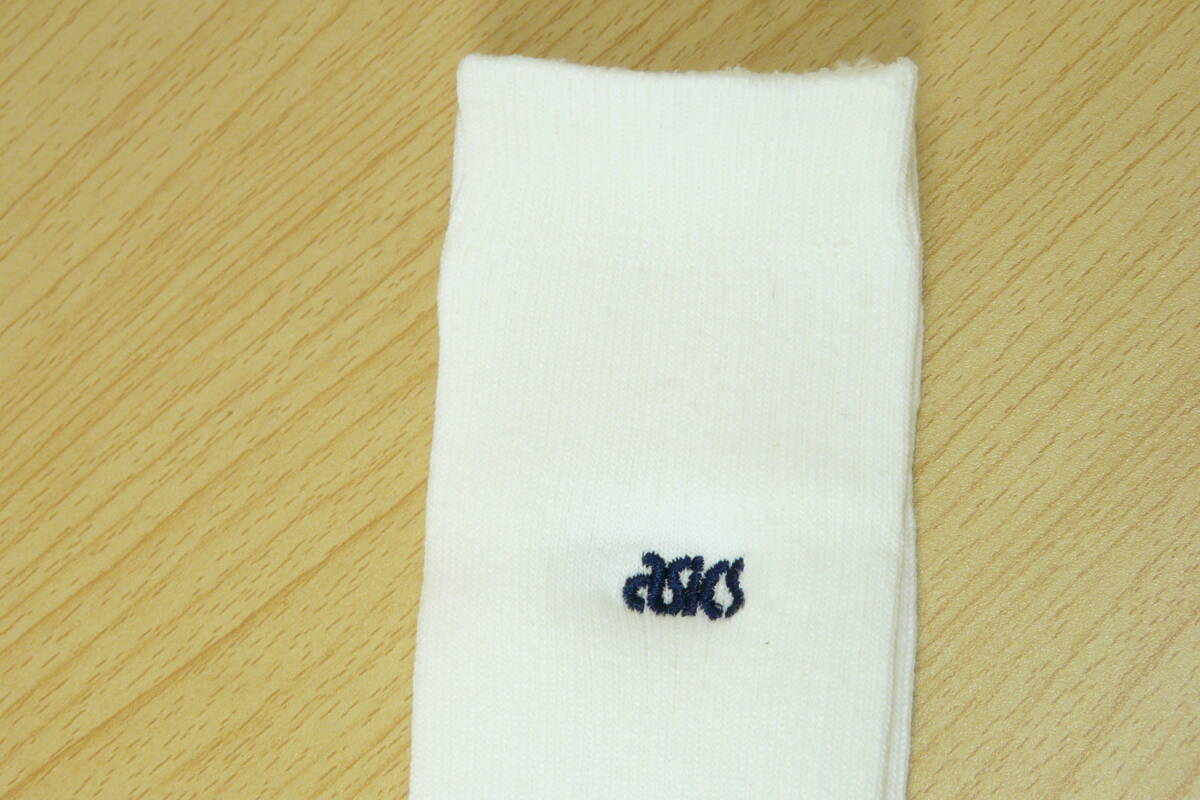 【商品について】 asicsのロゴのワンポイントが両面刺繍された、厚手の白ハイソックスです。asicsではひじょうに珍しい、3×1リブです。
