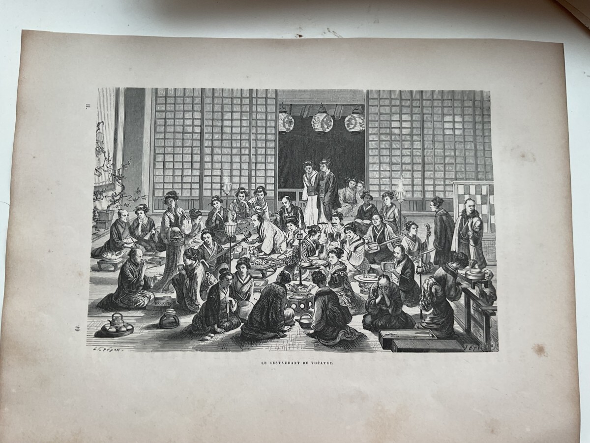 幕末1863年に、来日し、日本滞在中、当時の日本の風景や風俗習慣を記録し、帰国後1870年にパリのアシェット社から出版された稀覯本 幕末日本絵図に収められた木版画です。この版画は、当時の江戸の歌舞伎劇場に併設されていた料理屋を描いています。