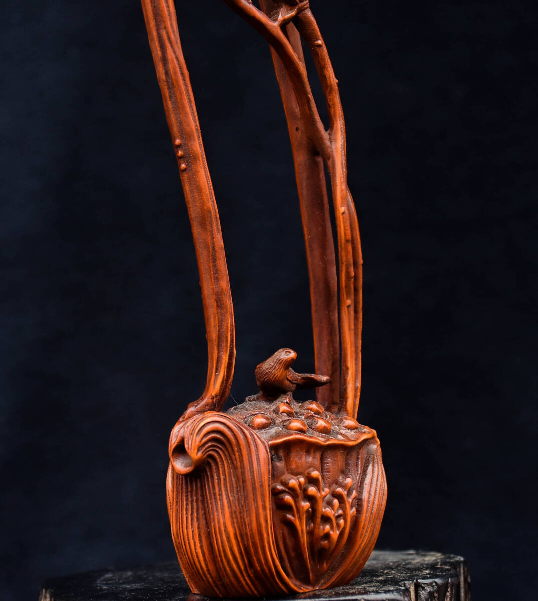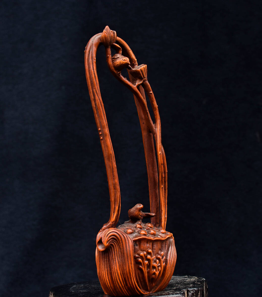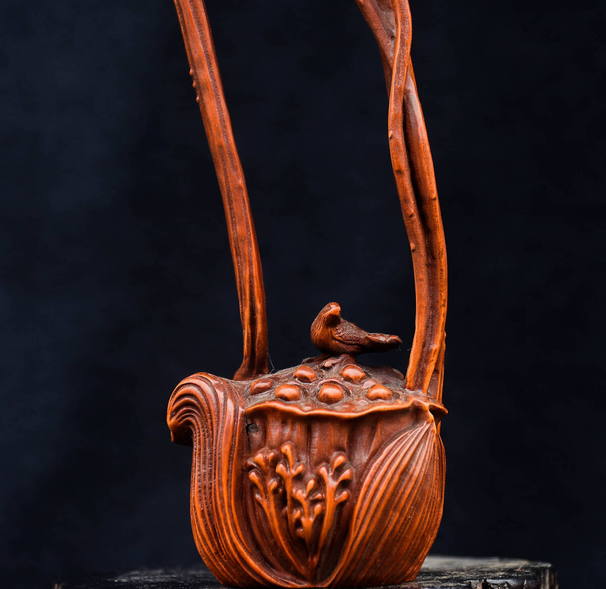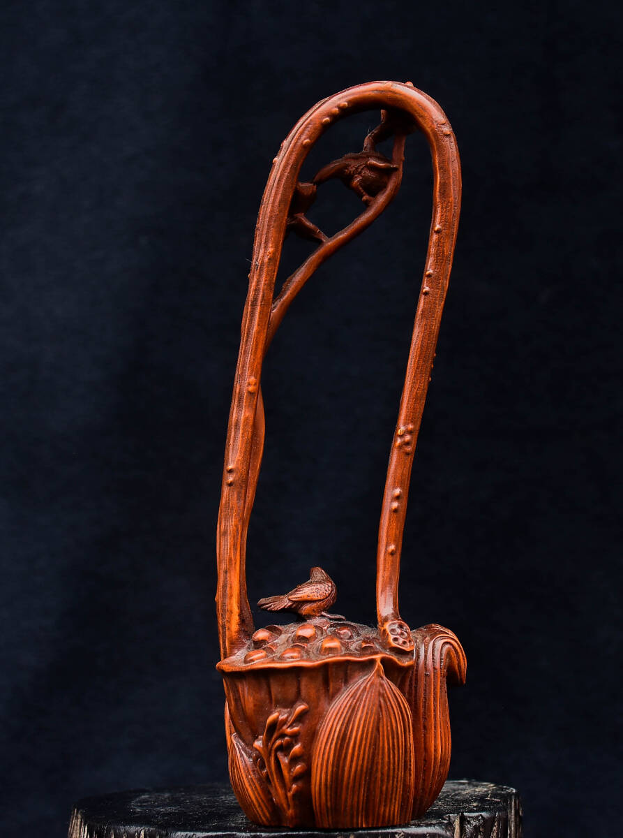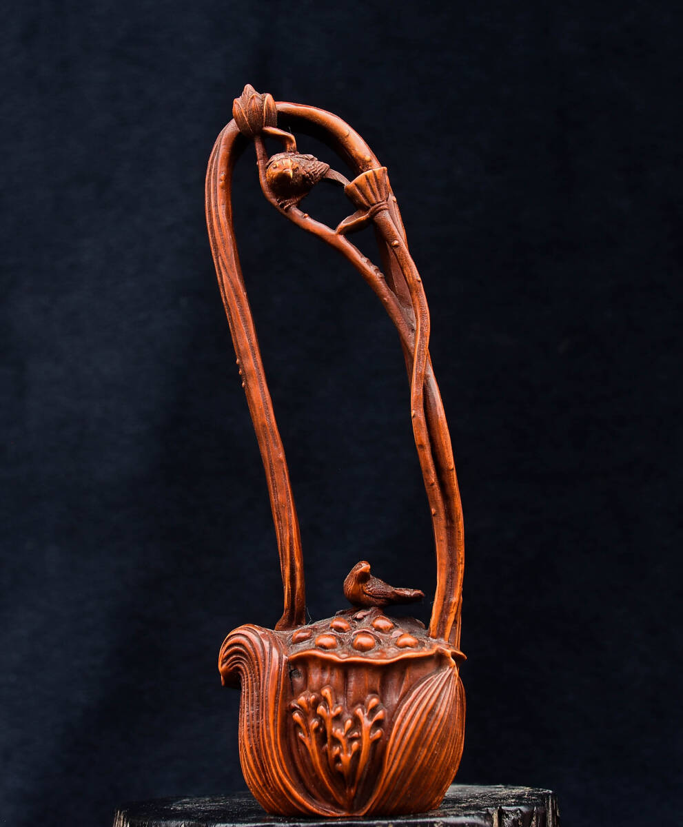 旧藏 黄楊木彫 提籃 籃子 花鳥紋 文案 置物 極細工 古賞物 古美味 東洋彫刻 時代物 骨董 中国古美術