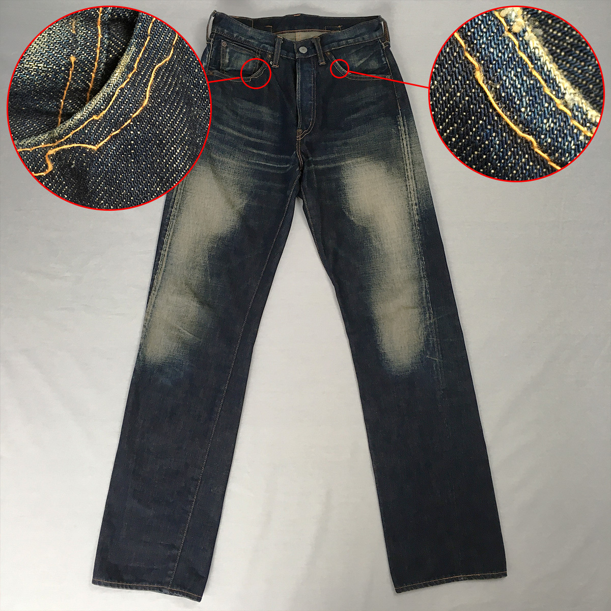 正面両ポケット入口のステッチ、フライ部分のステッチに解れ箇所があります。(※着用感がないので元からの加工によるものかもしれません)