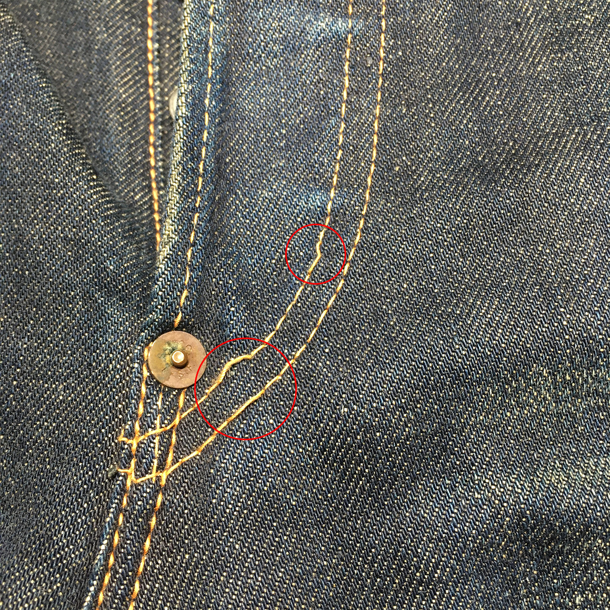 元からユーズド加工が施されており、アーキュエイトステッチの解れや、