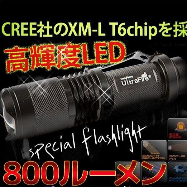 USA CREE XM-L T6チップ(Max 800ルーメンー充電池1EA当たりMAX700ルーメン)