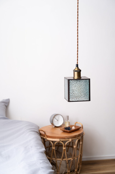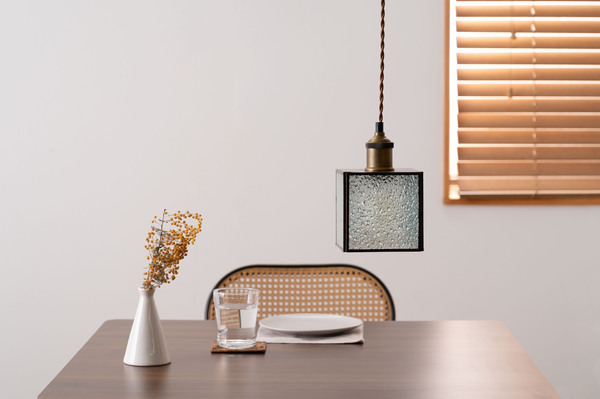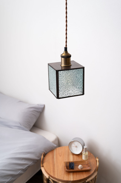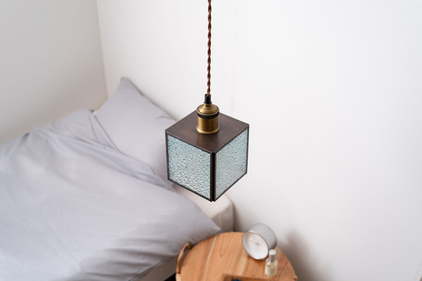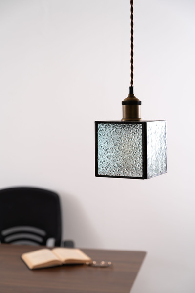 レトロ感漂うペンダントライト。ステンドグラスのシェードは立体的な模様が特徴的。どこか懐かしいノスタルジックな雰囲気を感じさせます。一灯はもちろん。広範囲には多灯付けがです。 形も特徴的なステンドグラス。シンプルだけど可愛らしいステンドグラスは消灯時にも立体的なデザインがインテリアとして演出してくれます。 点灯時の表情の変化。シェードの内側は光を反射して美しいデザインを楽しめます。消灯時とはまた違った表情をお楽しみください。 ご家庭のシーリングプラグに付けられます コードの長さを調整できます