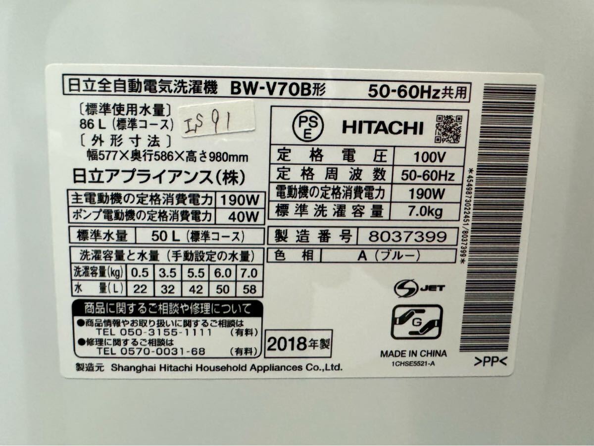 大阪送料無料★3か月保障付き★洗濯機★日立★7kg★2018年★ BW-V70B★IS-91