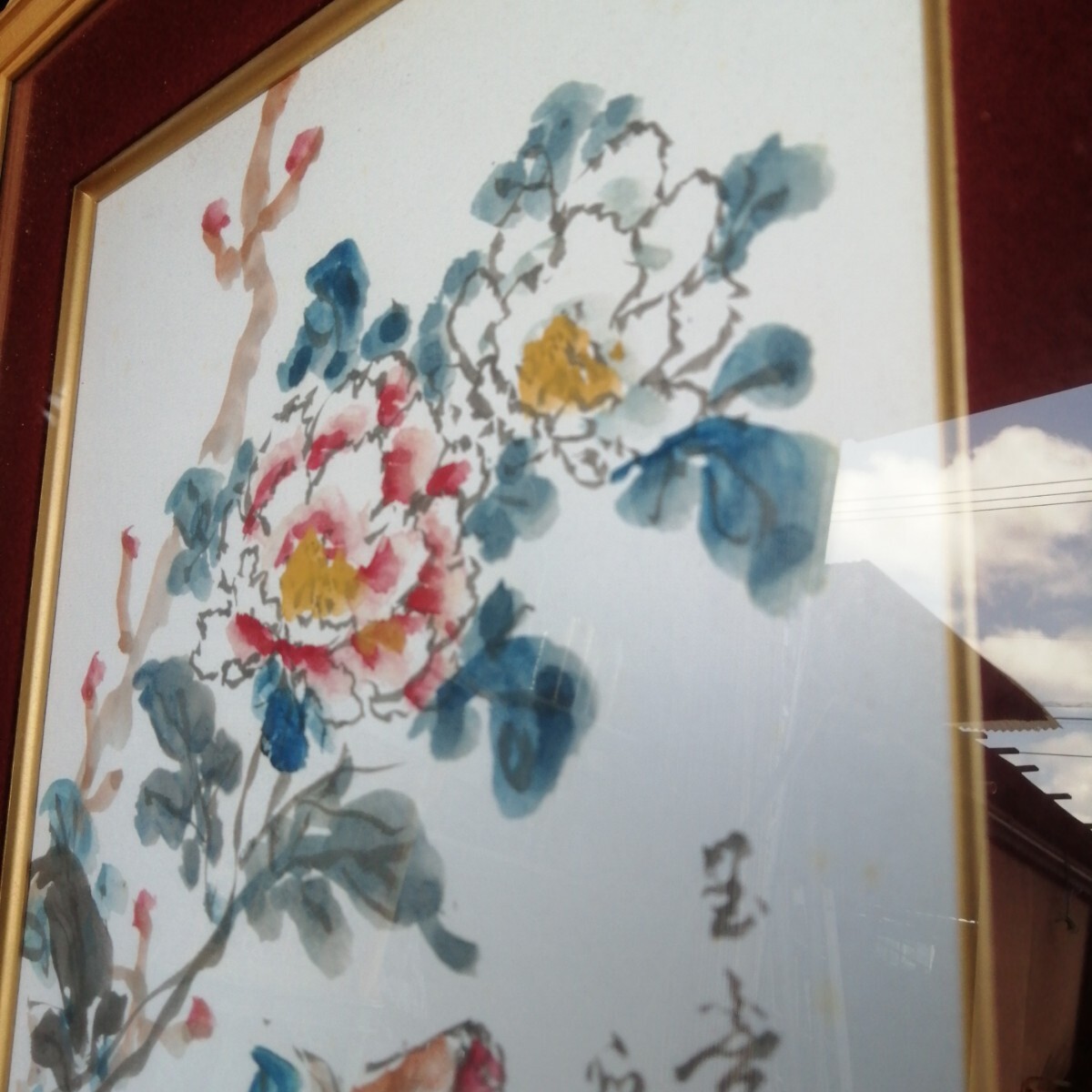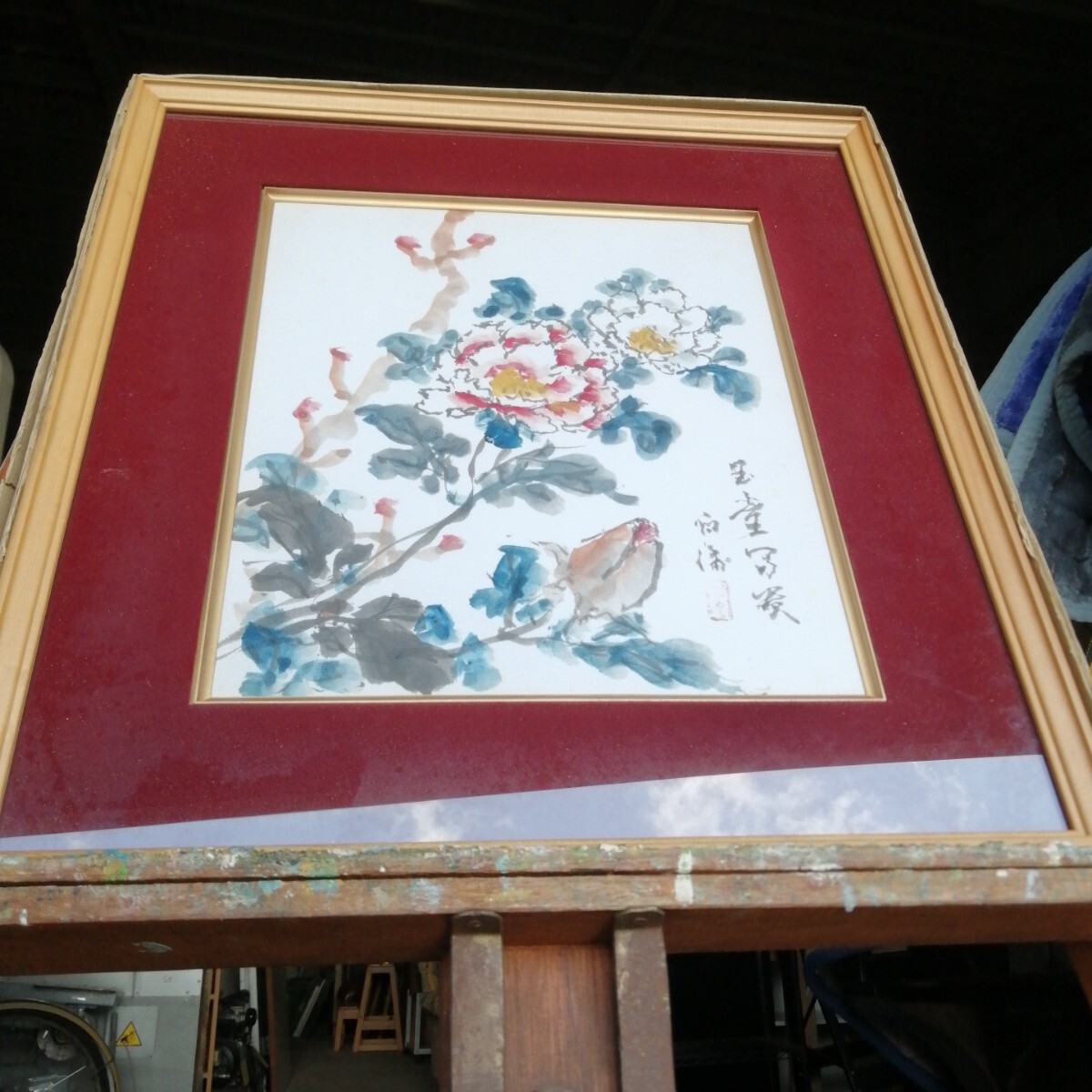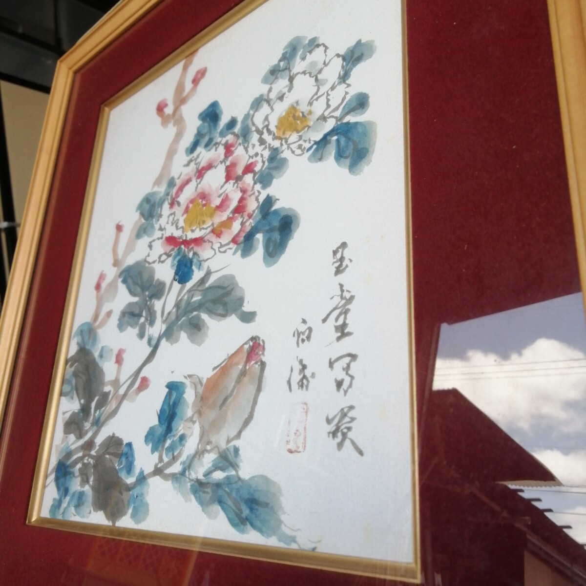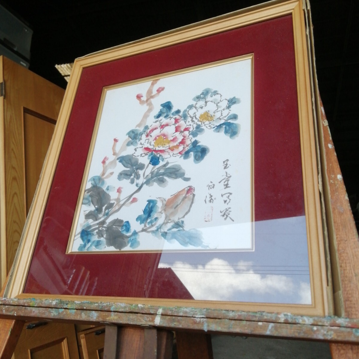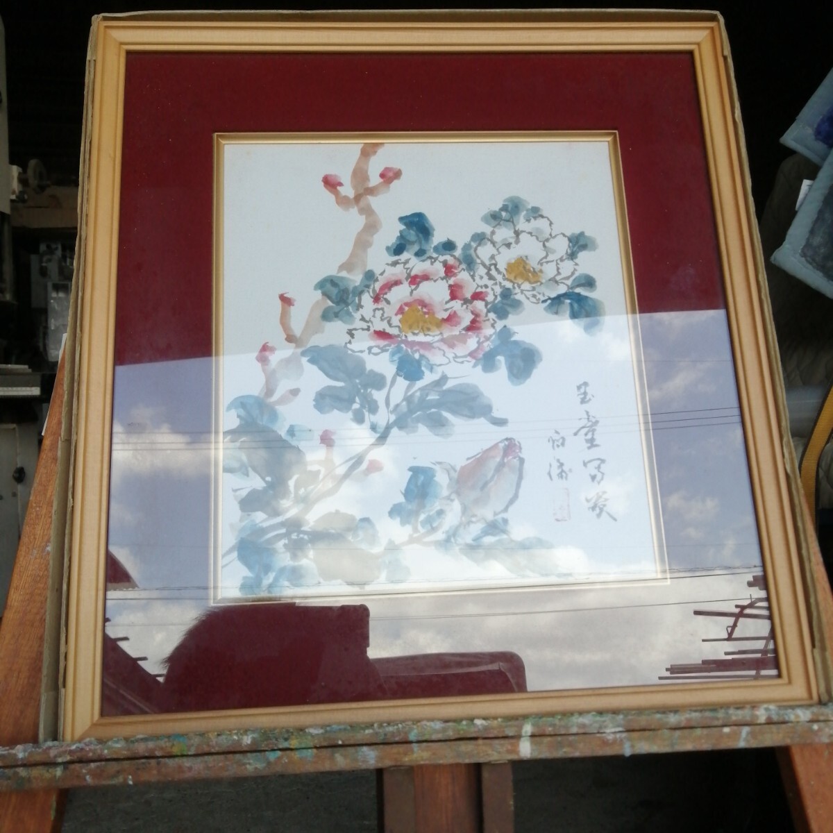 水墨画 額装入り 作者不明 サイン有り 花 絵画 玉 富 白