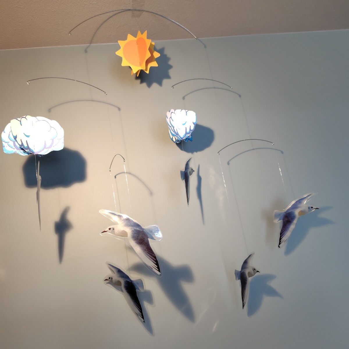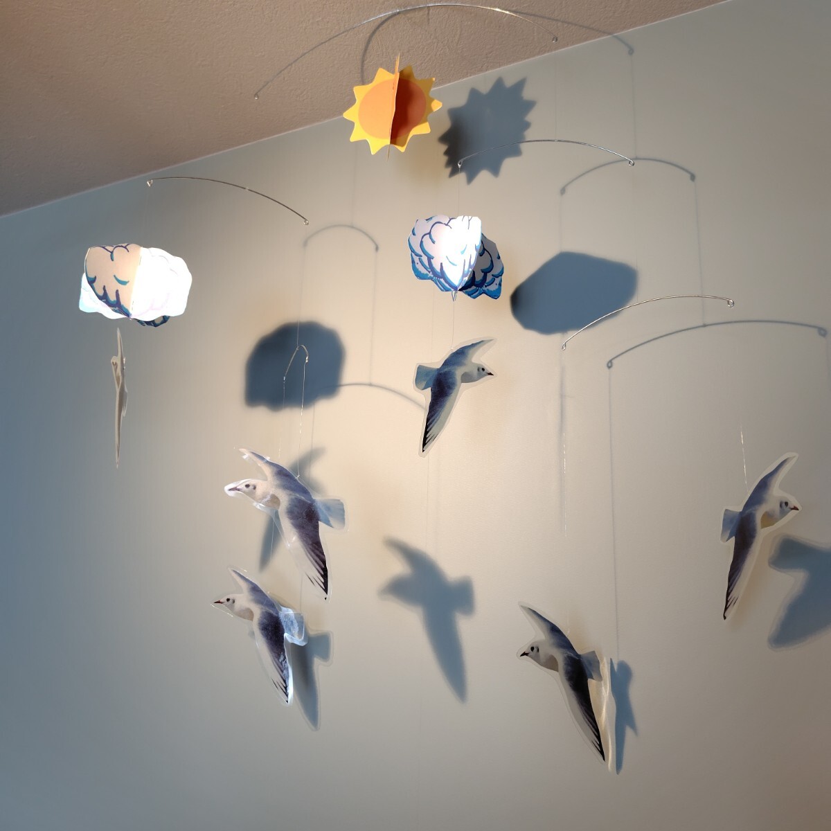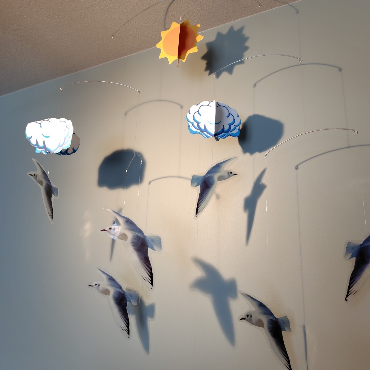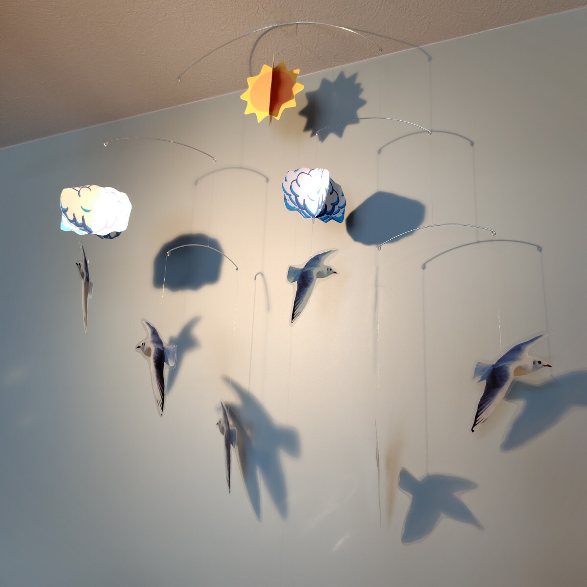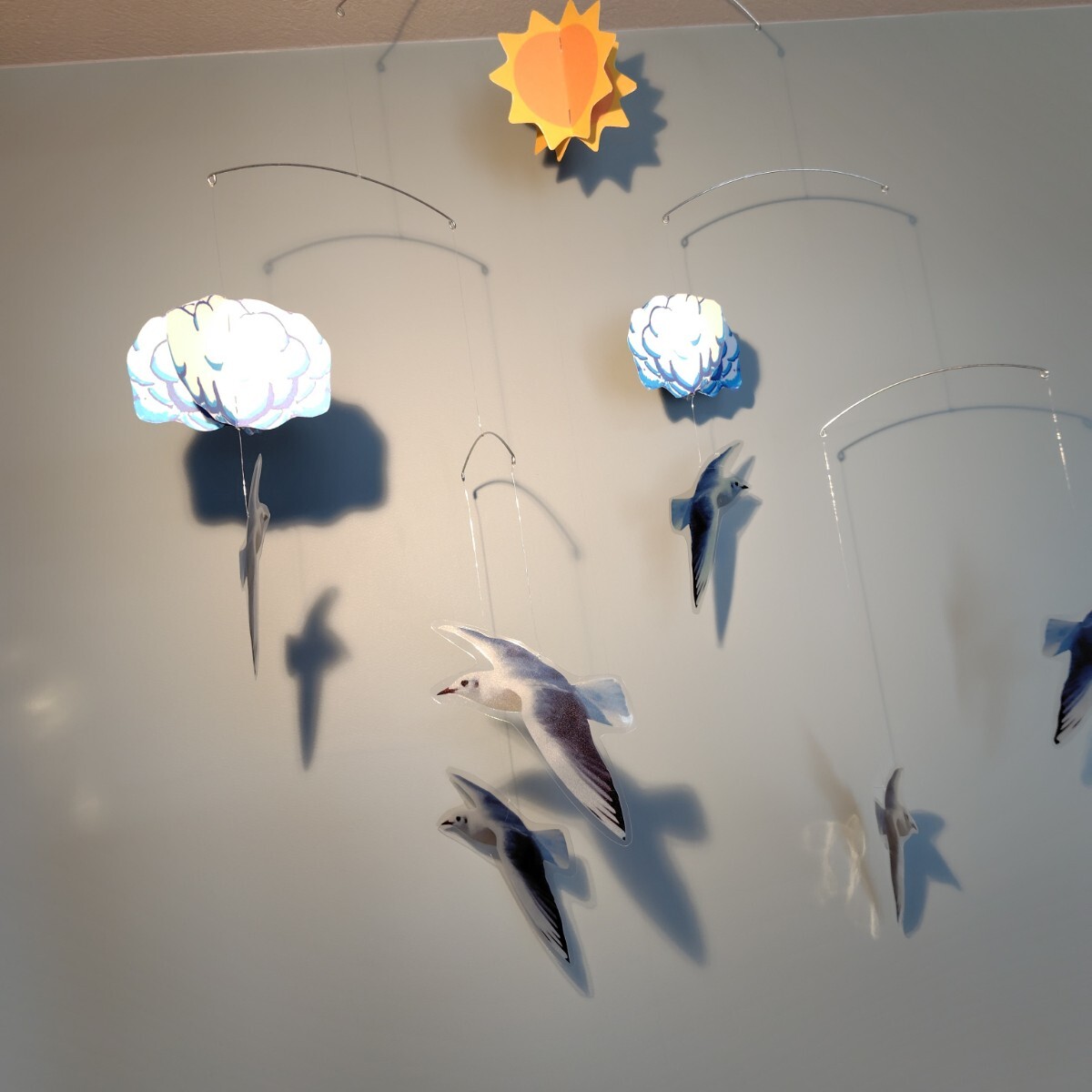 モビールとは動く彫刻。鳥を糸や針金でつるし、それらがバランスを保ちながら、わずかな風で微妙に動くようにしたものです(*^^*)