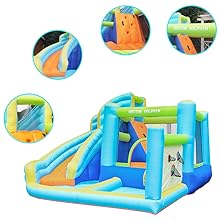 【付属品】ブロワー、本体用ホース、専用バッグ、パイプ固定用ピン、固定用ペグ、ハンマー、補修用生地、手持ちの簡易水鉄砲x2 ※新しい補修生地は透明なステッカーになります。縫うことは不要、貼り付けだけで済みます。※簡易水鉄砲の色はランダムで選択できません、予めご了承ください。※ご使用になった後はよく空気を抜かないとバックに収まりません。