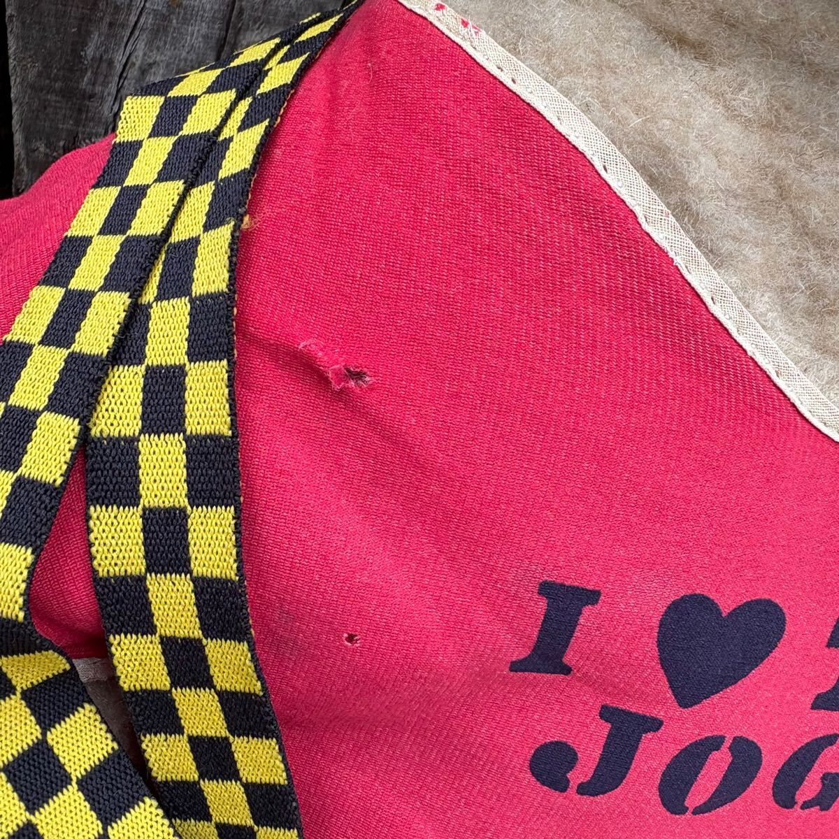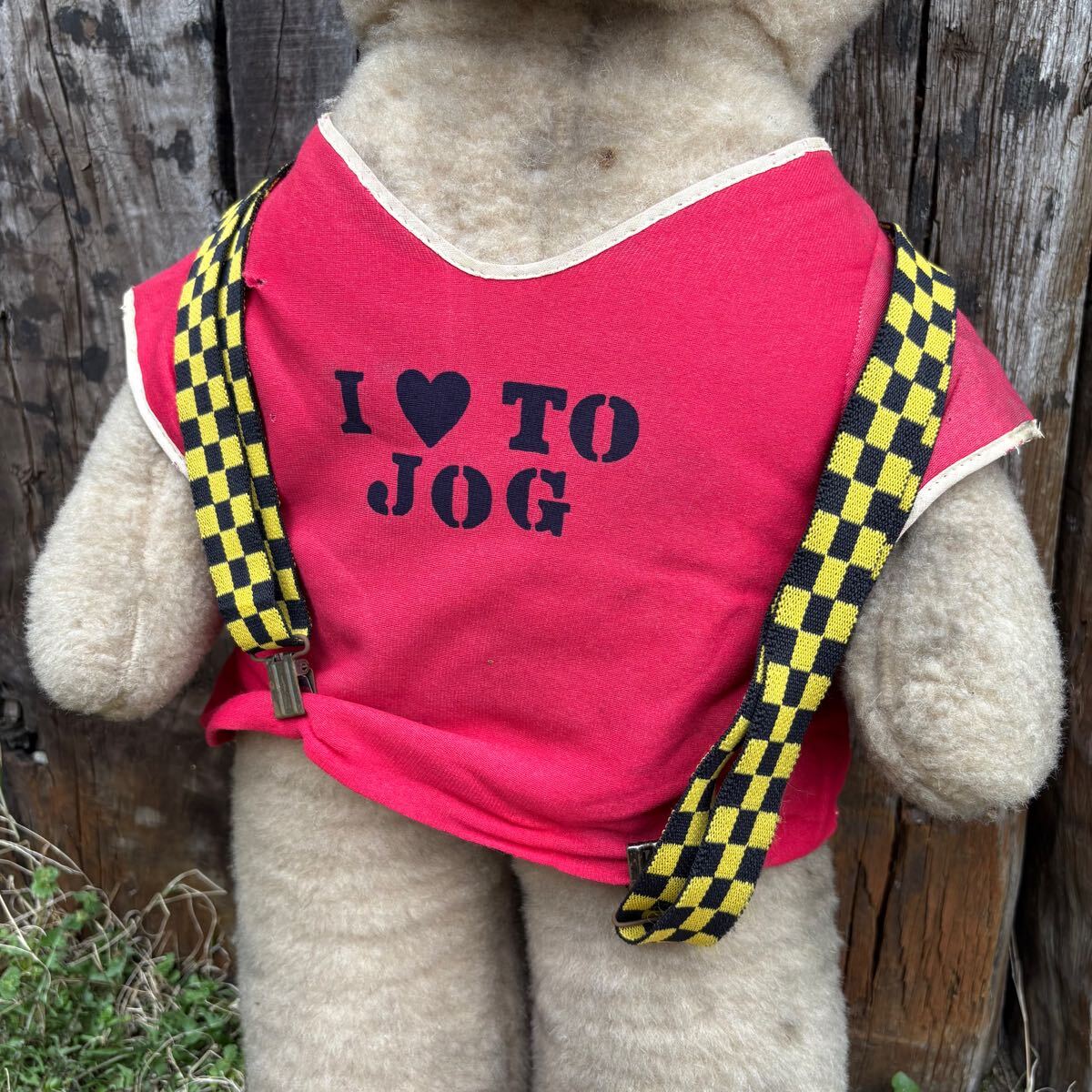 「I LOVE TO JOG」と書かれた赤の半袖トップスに