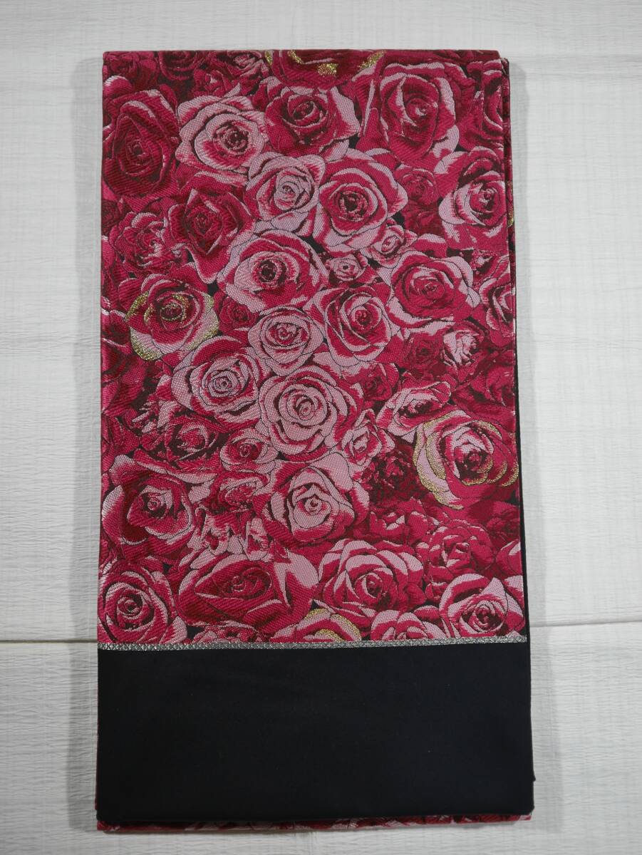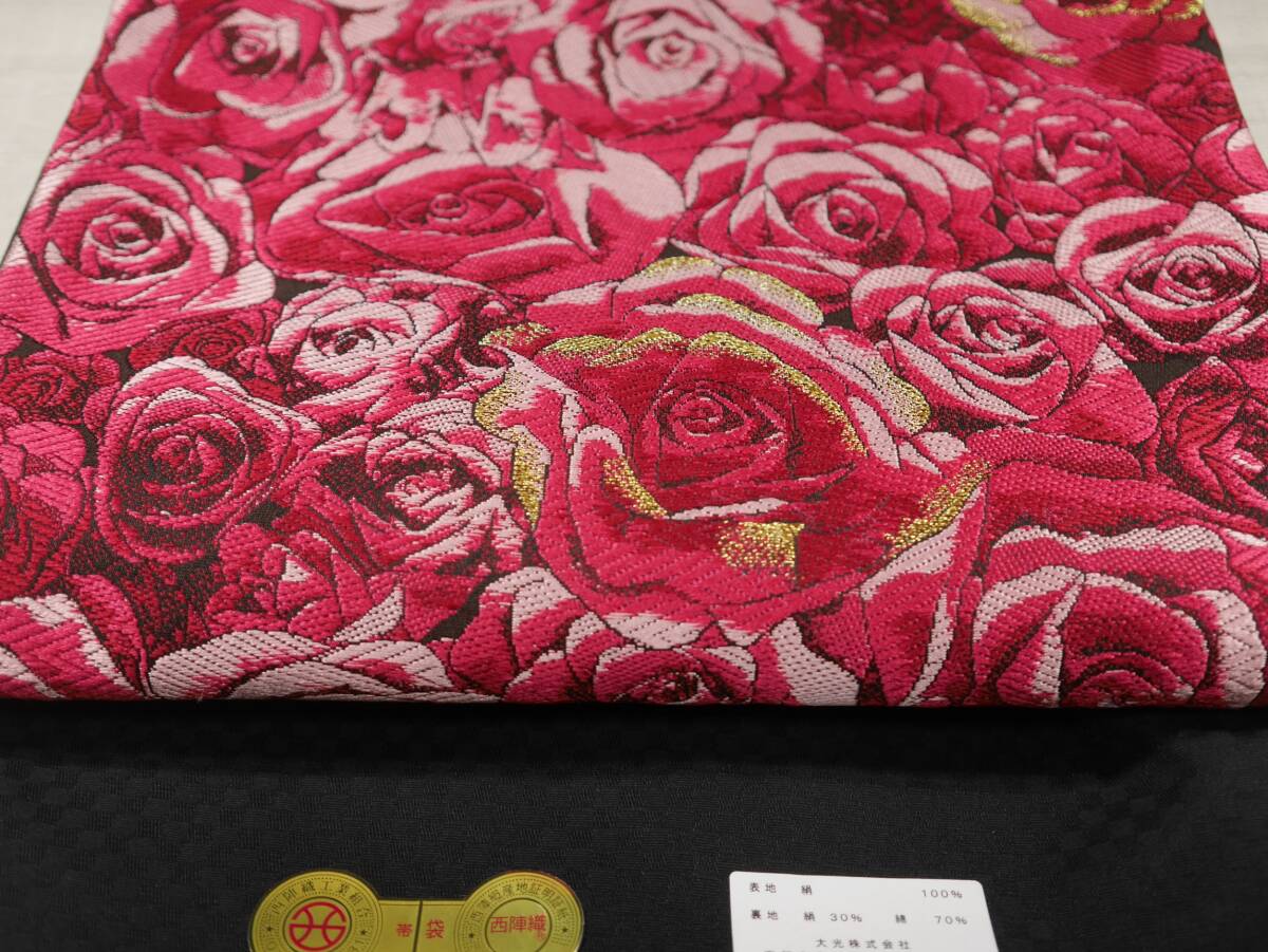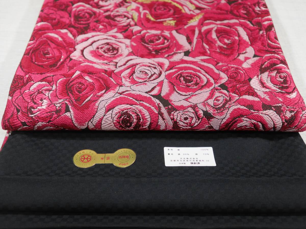 西陣織の名門大光(株)より織りあがったばかりの袋帯です。黒の帯地に満開の赤バラが咲き誇る上品なエレガントな袋帯です。周りの皆の雰囲気が明るくなって和やかな雰囲気となります。粋なお着物、お洒落なお着物の柄合わせにいかがでしょうか。お仕立てには三河の綿芯を入れ手縫い仕立てを致します。お仕立て上がりには3~5日のご猶予お願い致します。