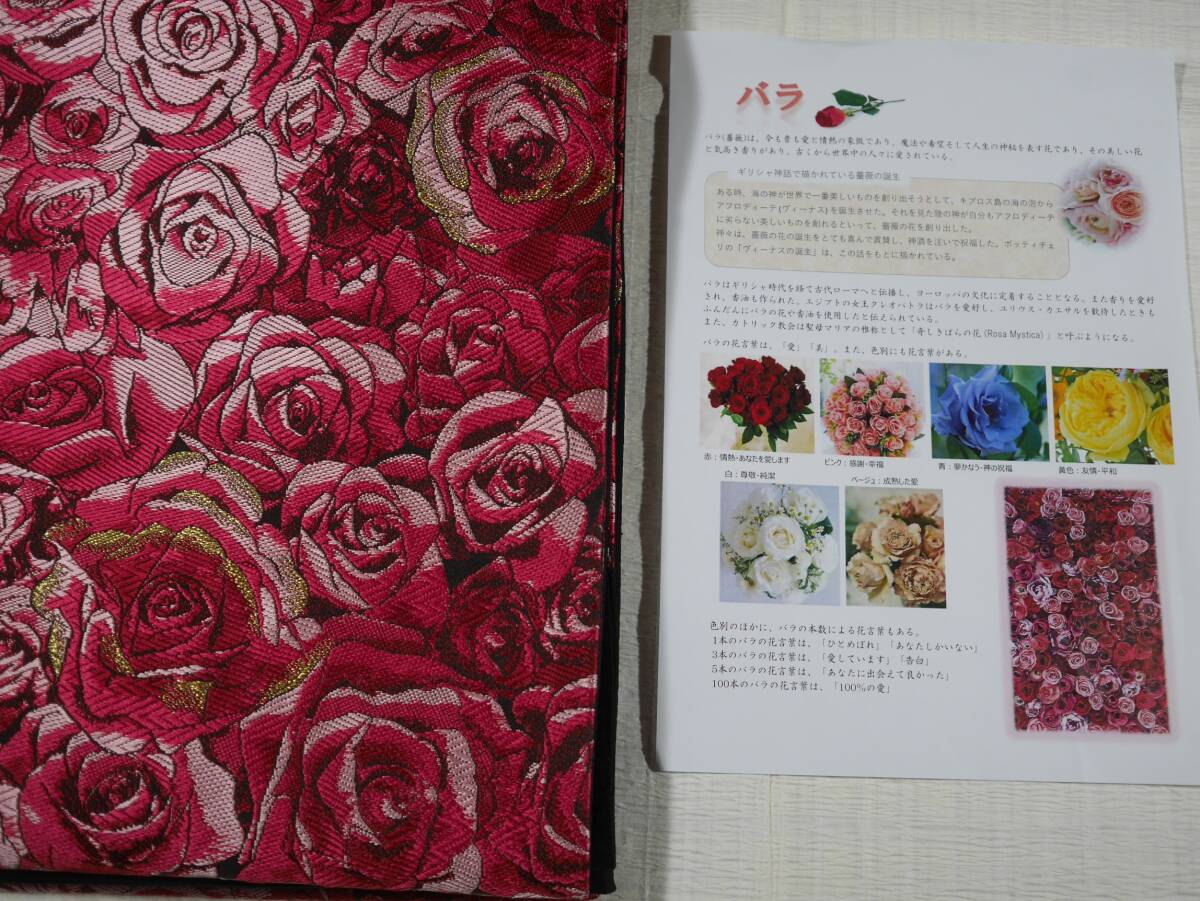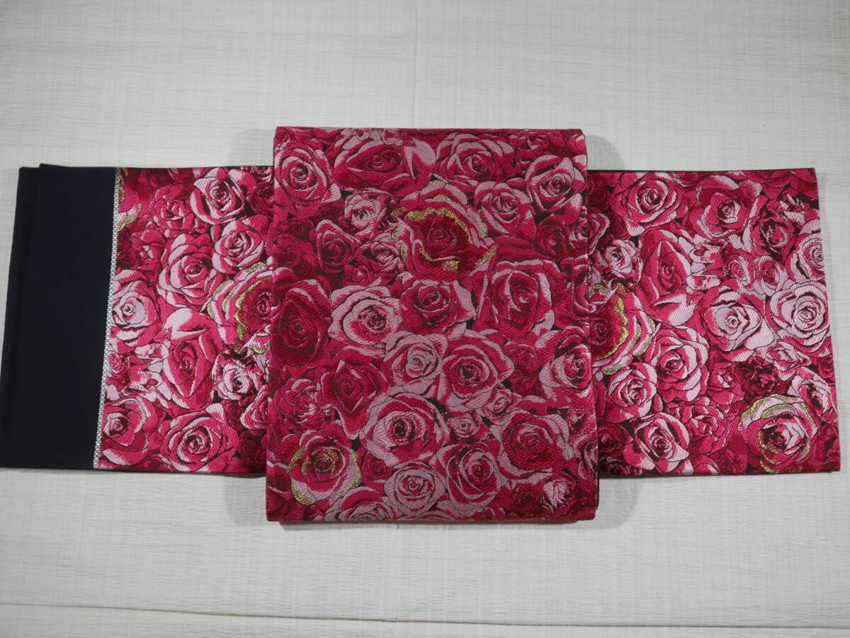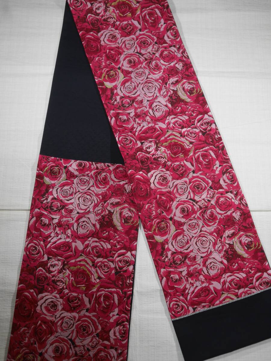 西陣織の名門大光(株)より織りあがったばかりの袋帯です。黒の帯地に満開の赤バラが咲き誇る上品なエレガントな袋帯です。周りの皆の雰囲気が明るくなって和やかな雰囲気となります。粋なお着物、お洒落なお着物の柄合わせにいかがでしょうか。お仕立てには三河の綿芯を入れ手縫い仕立てを致します。お仕立て上がりには3~5日のご猶予お願い致します。