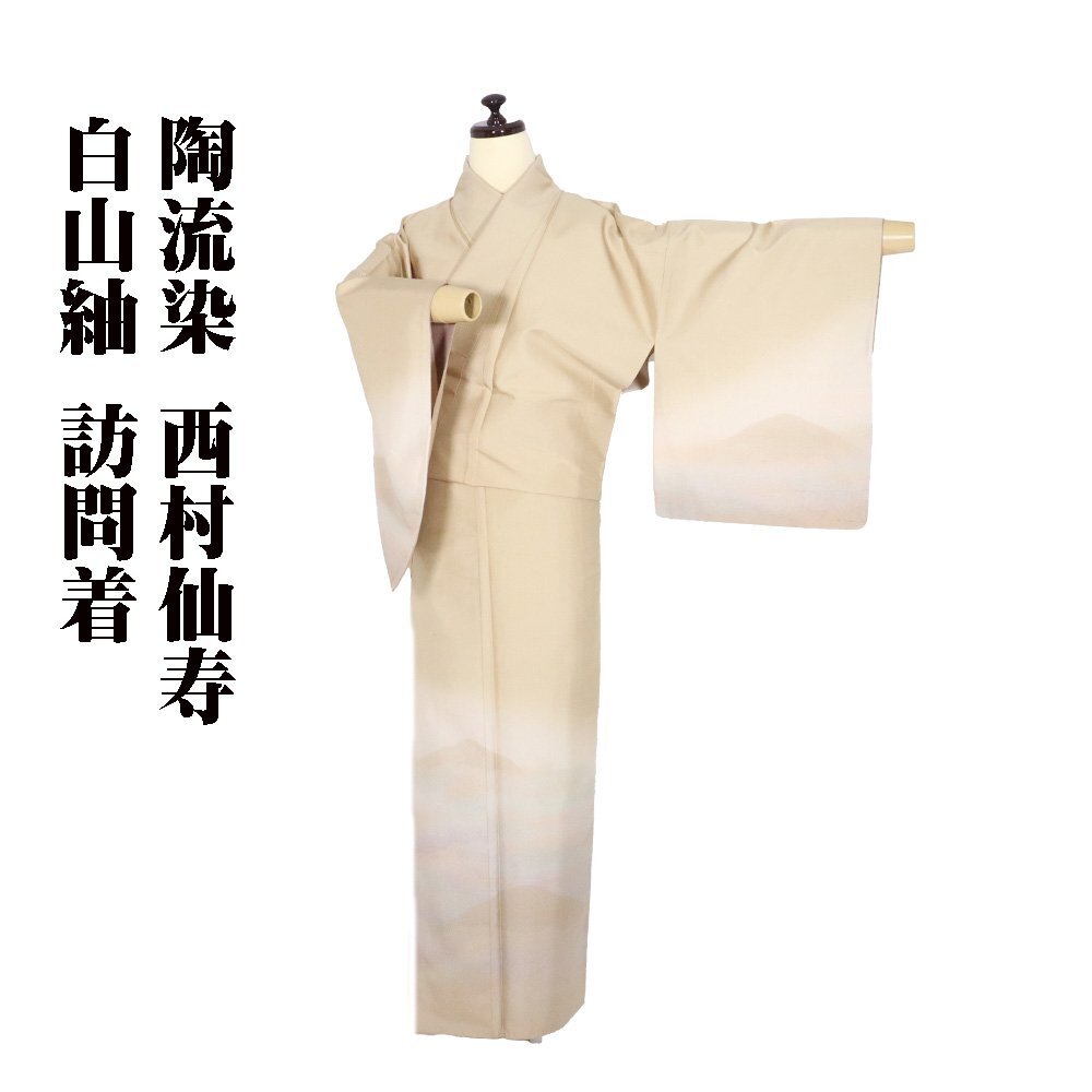 | 陶流染 西村仙寿氏作 白山紬 訪問着 袷 薄茶(木蘭色)暈し地 遠山 164 広襟 作家落款入り | |