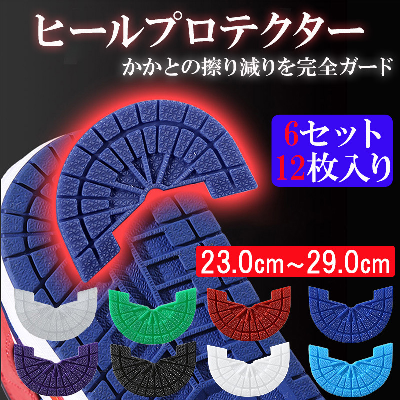 6個セット 12枚入り ヒールプロテクター ソールガード スニーカー かかと 保護 3足 黒 青 赤 透明 補修(23.24.25.26.27.28.29.cm)
